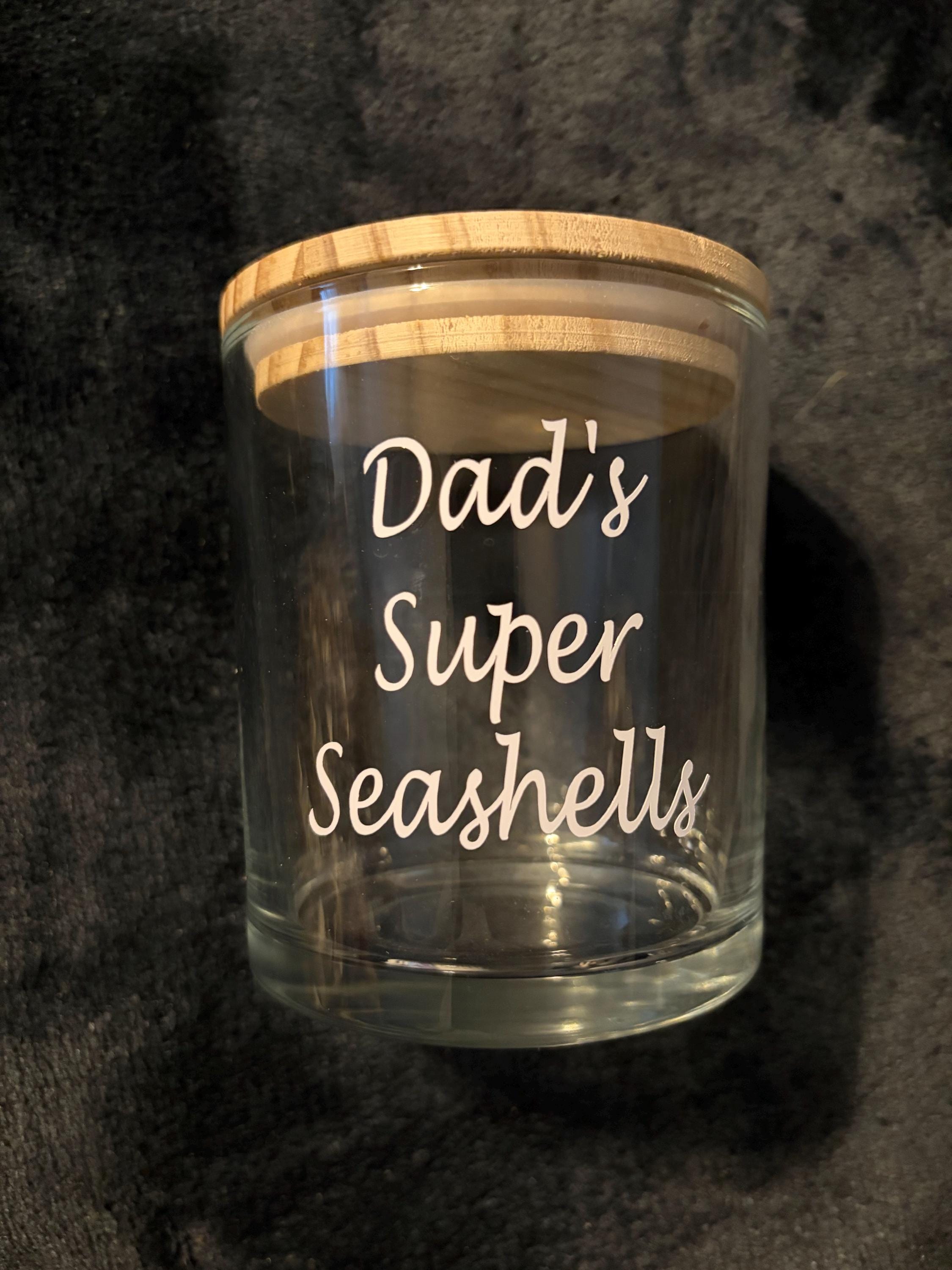 This custom glass jar is a beautiful way to display your beach treasures! This container is the perfect size for a shelf, desk or nook - not too big and not too small - just the right size for your collections. Each 14 ounce jar measures 4" tall and 3.5" wide and the wooden bamboo lid has a rubber gasket which keeps it tightly closed.