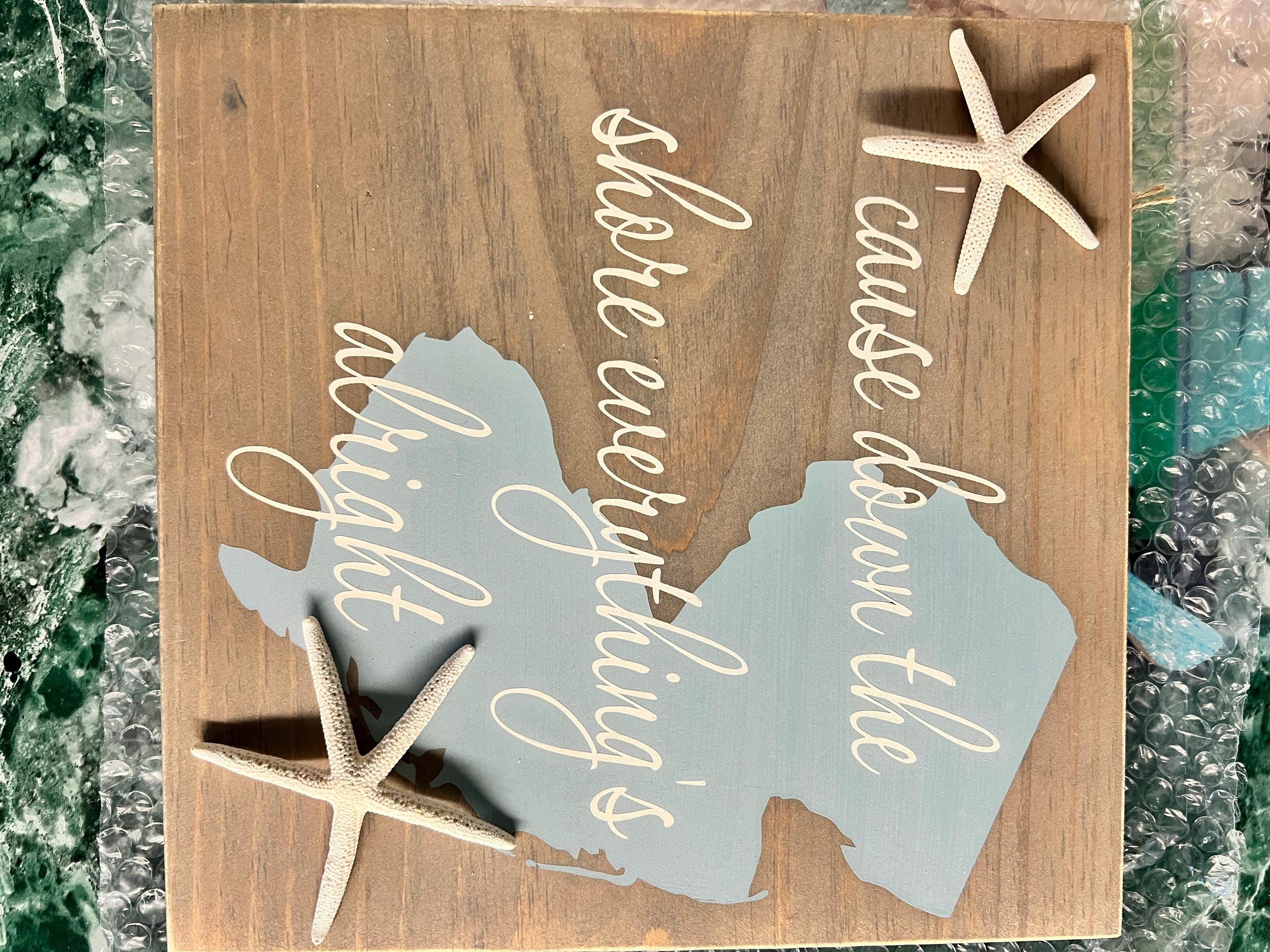 This "cause down the shore everything's alright" is done on a beautiful, grey stained piece of wood with a light blue silhouette of the state of New Jersey and ivory script lettering. There are two, genuine starfish that compliment the ivory lettering giving this sign a beachy feel. This square sign is lightly distressed and measures 9.5" wide by 9.5" high and is 3/4" thick. The sign has a saw tooth hanger on the back for easy wall mounting or simply prop up on a shelf!