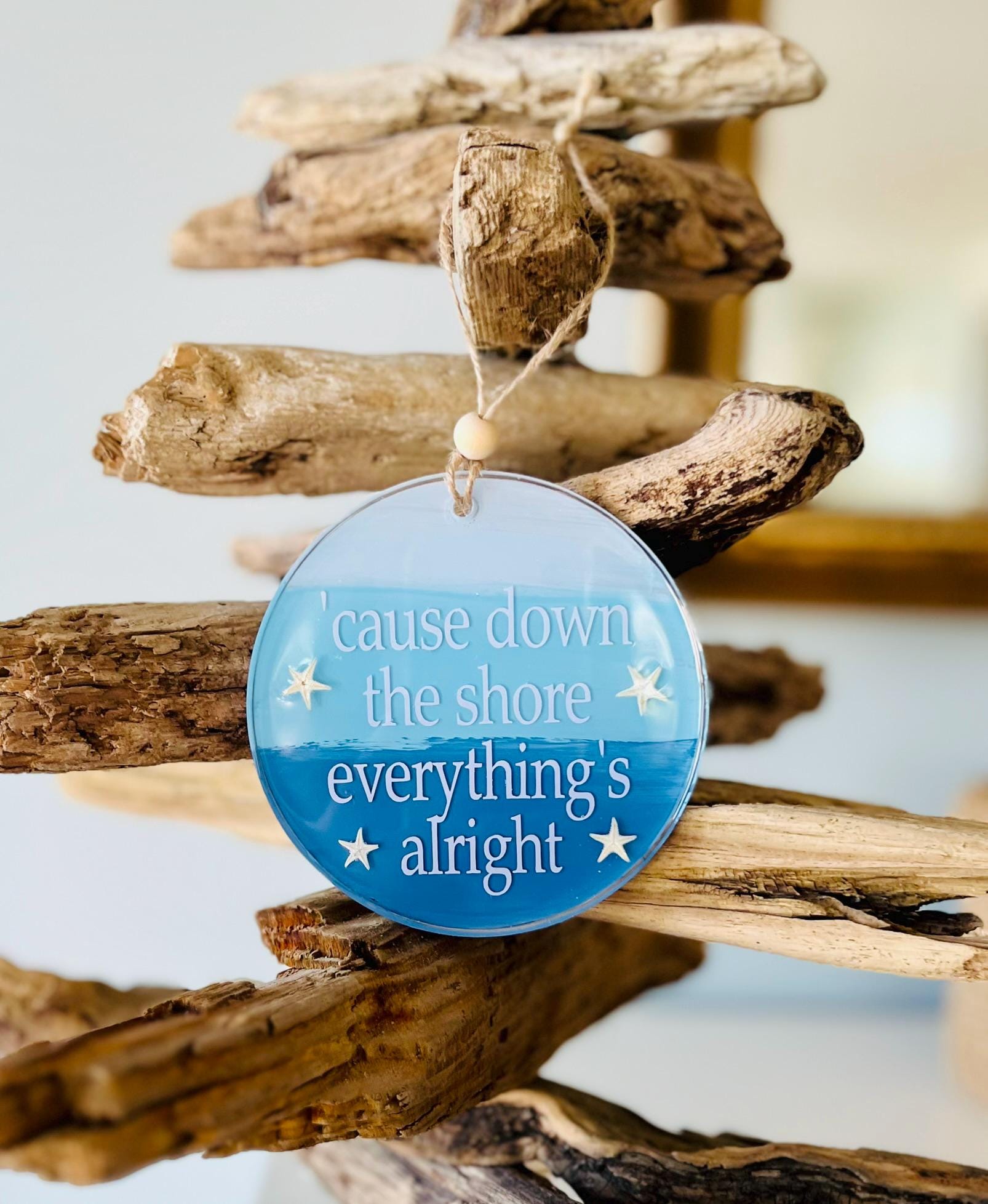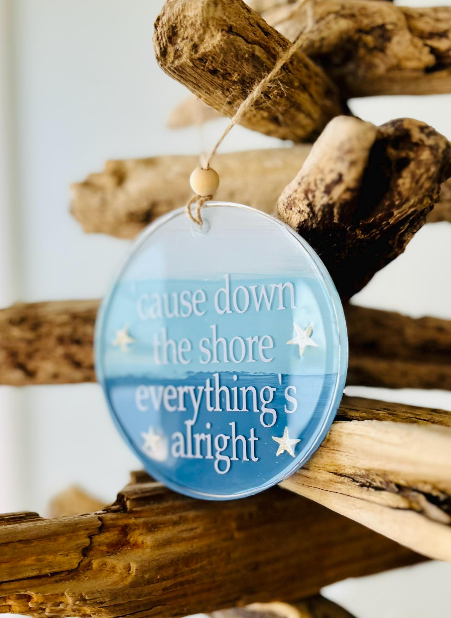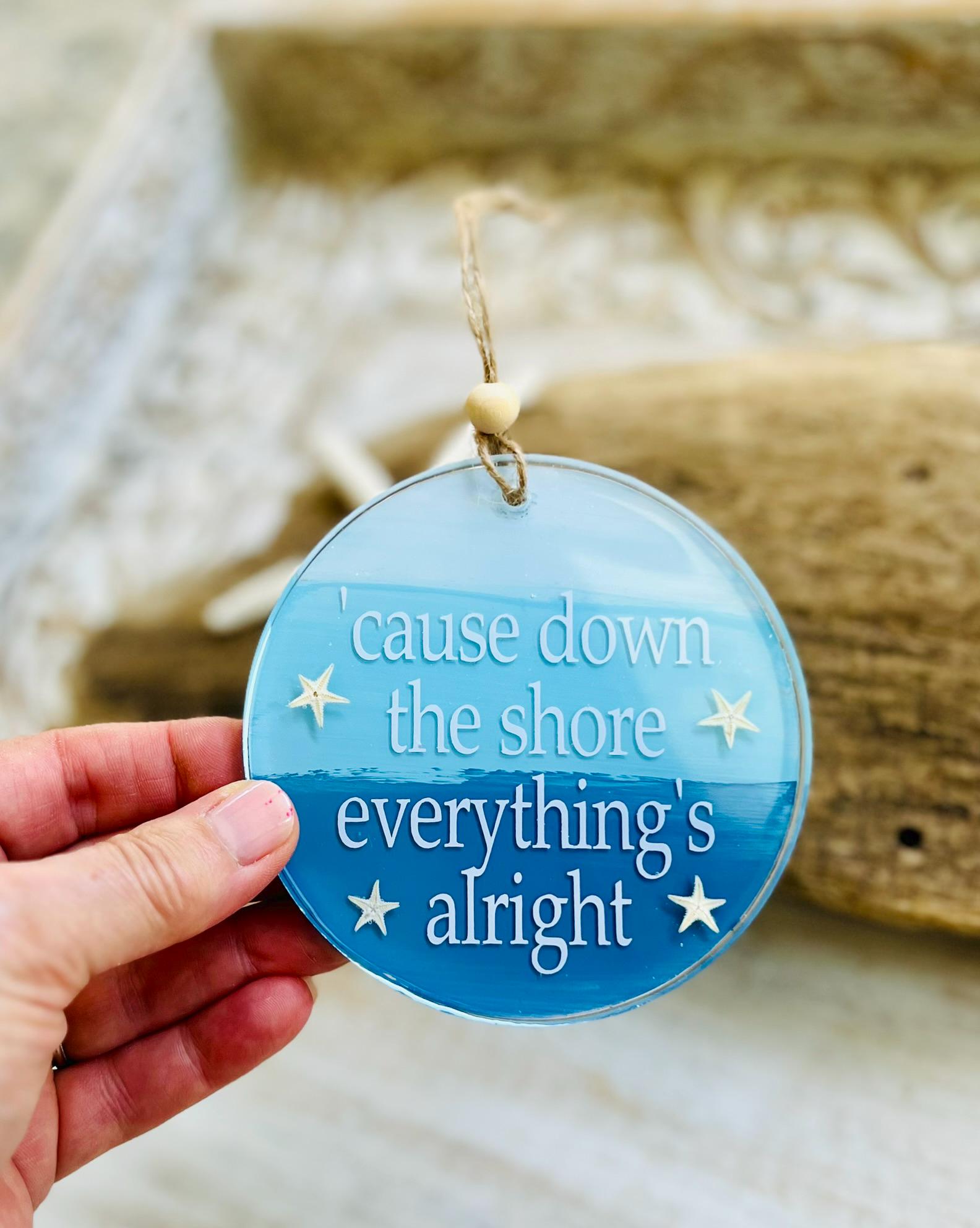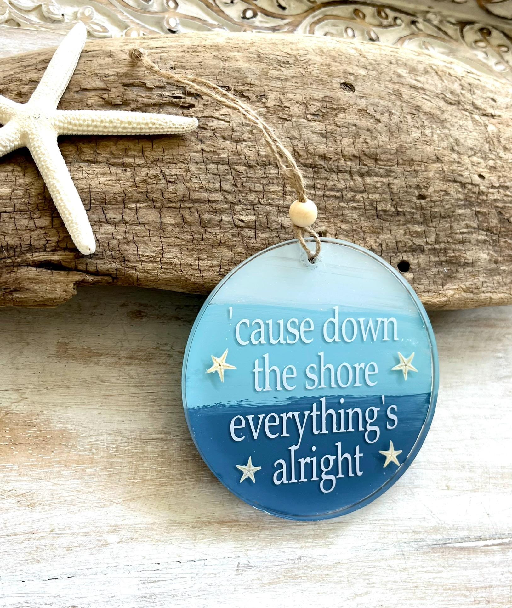 This 'cause down the shore everything's alright ornament is a 4" circle with hand painted layers of blue with white lettering and genuine starfish accents all set in resin making it very durable. There is twine for hanging with a wooden bead detail to give it an extra beachy look.
