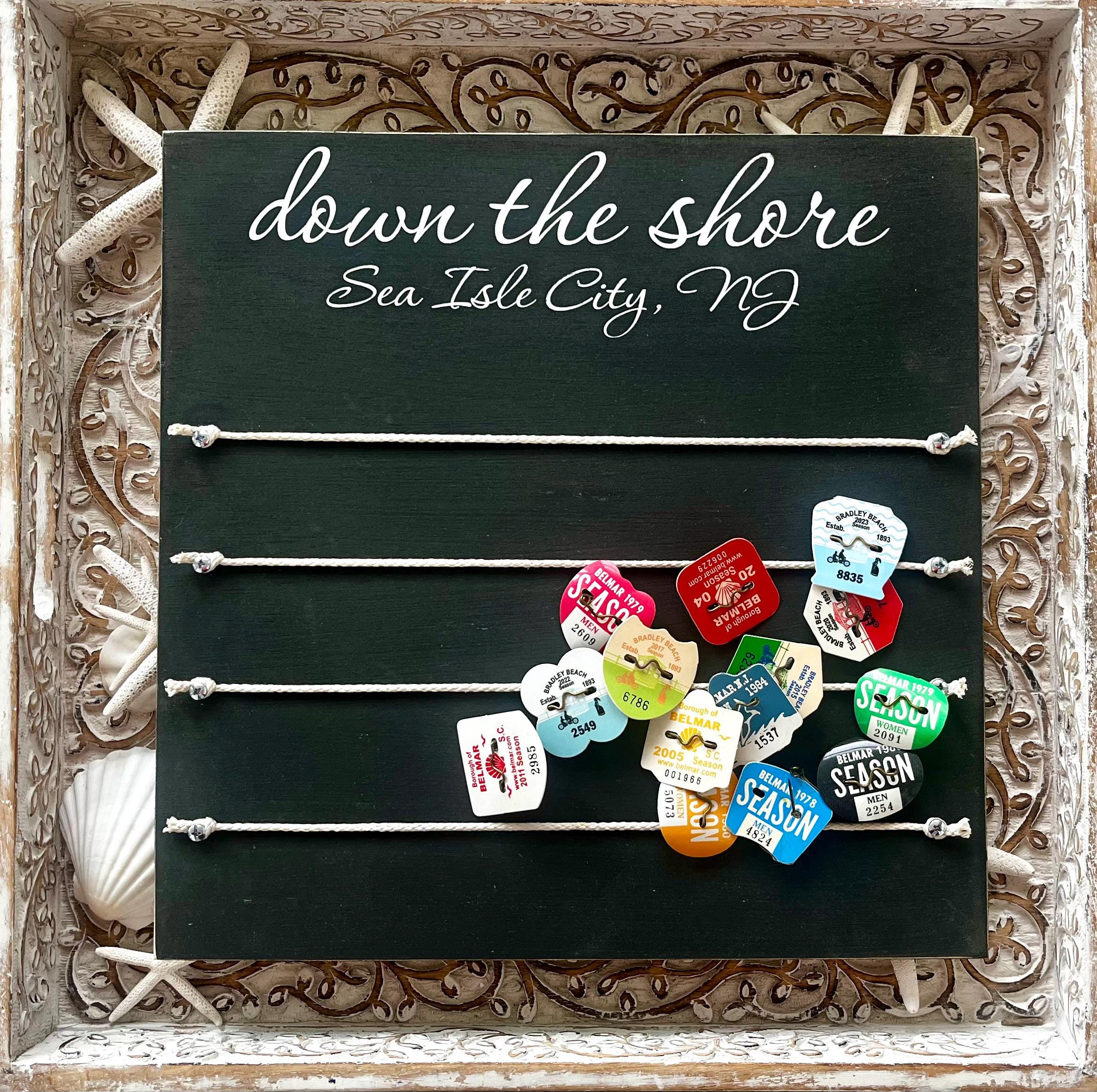 This custom beach tag and beach badge display is the perfect way to display those memories from days spent at the shore! This beach badge holder is shown with the phrase "down the shore" with the town and state below but you can personalize your sign with the phrase of your choice if you would like something different. You might want a town name on top and coordinates below or a family name, established date, etc. You can have two lines of wording, just provide the information you would like for your sign in the personalization section when ordering. If you have any questions feel free to message me prior to ordering.