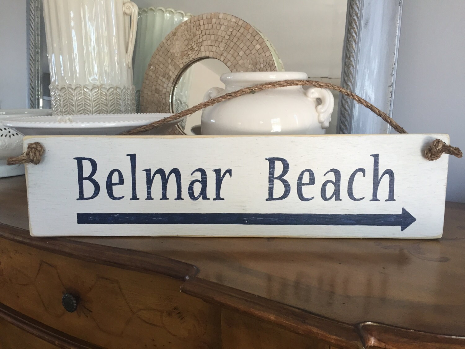 Beach sign in off white with navy lettering ~ choose your own color combination and beach destination.! Great for a beach house, a housewarming gift or for a destination vacation you want to remember. The sign is finished with a coat of matte polyurethane and has a rope hanger or you can request a sawtooth hanger on the back for easy wall mounting. Please note that you can also change the direction of the arrow if needed, just let me know.