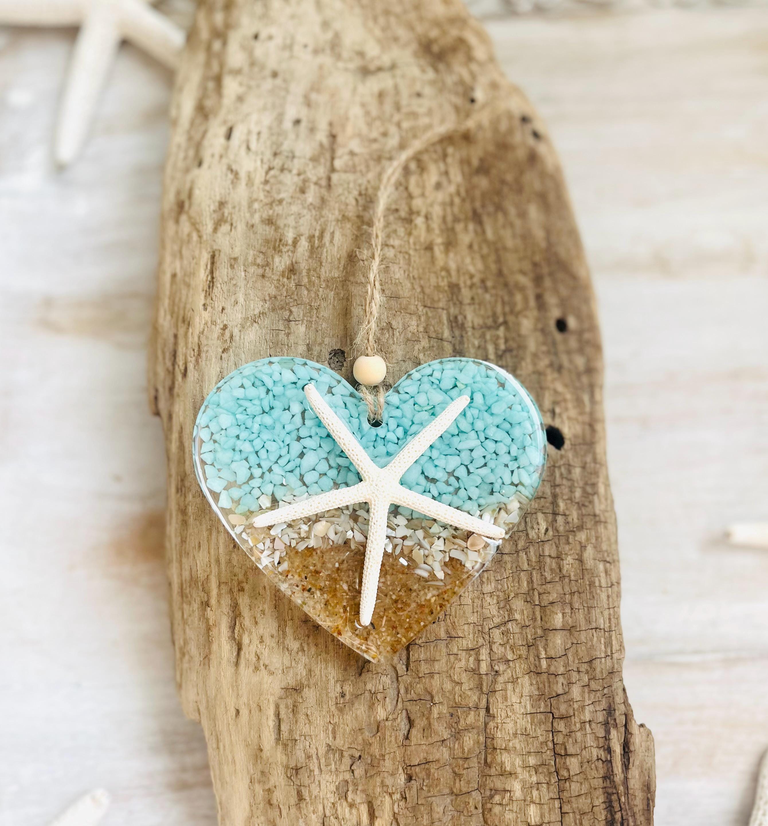 This resin heart ornament makes a unique gift for Valentine's Day, an anniversary, birthday, Mother's Day or even a wedding. Each handmade piece consists of sand, crushed abalone shells, crushed aqua stones and a genuine starfish set in a 4" resin heart shape. A twine hanger and a wooden bead detail give it an extra beachy touch. This is a beautiful addition to your coastal Christmas decor, for the Hanukkah season or simply enjoy as a sun catcher to be displayed year round.