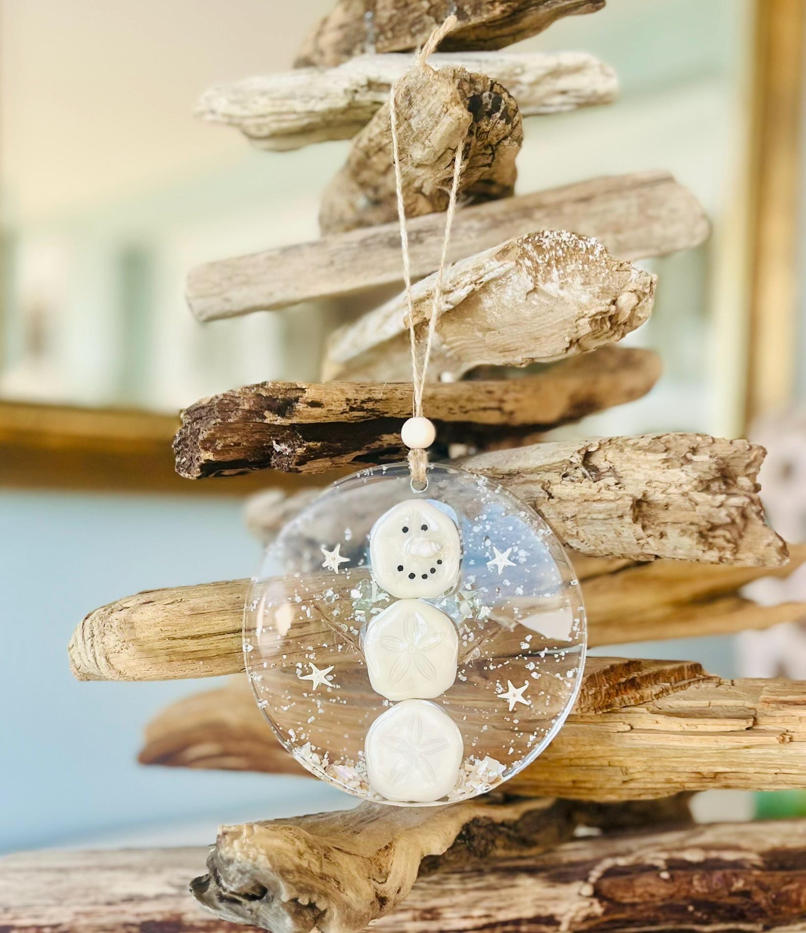 The entire snowman ornament is set with resin in a 4" circle ornament making it sturdy and durable (sand dollars can tend to be fragile otherwise). A twine hanger and a wooden bead detail give it an extra beachy touch for your coastal tree for the holidays or enjoy as a sun catcher.