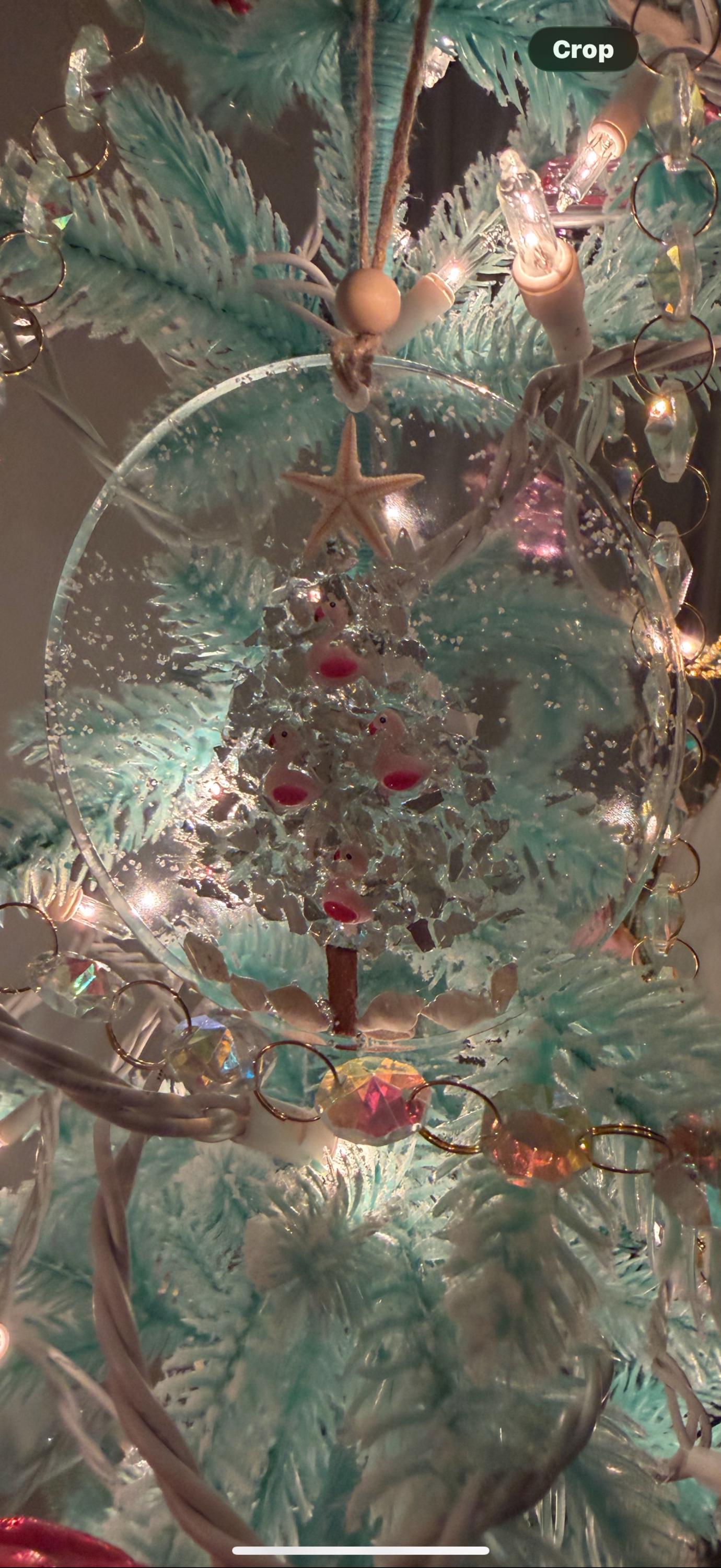 This pink flamingo scallop ornament is a playful addition to your coastal holiday decor. These are perfect for a beachy Christmas theme or a great gift for anyone who loves collecting flamingos. This beautiful coastal Christmas tree ornament is made of silver crushed glass with flecks of mirrored pieces, pink flamingos added to the tree, crushed shells at the base of the tree, white sand to look like falling snow, a piece of driftwood for the trunk and a tree topper starfish set in a 4" circle resin ornament. The starfish on top is a genuine, flat, real starfish. A twine hanger and a wooden bead detail give it an extra beachy touch!