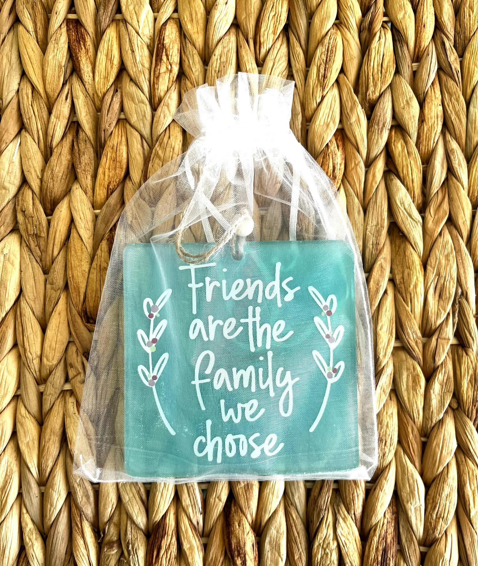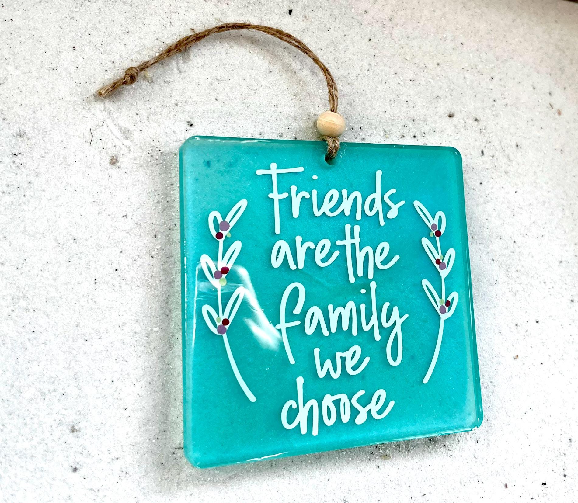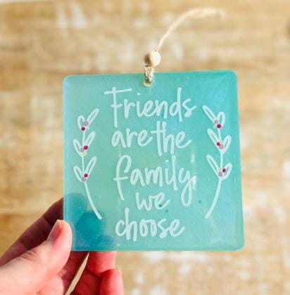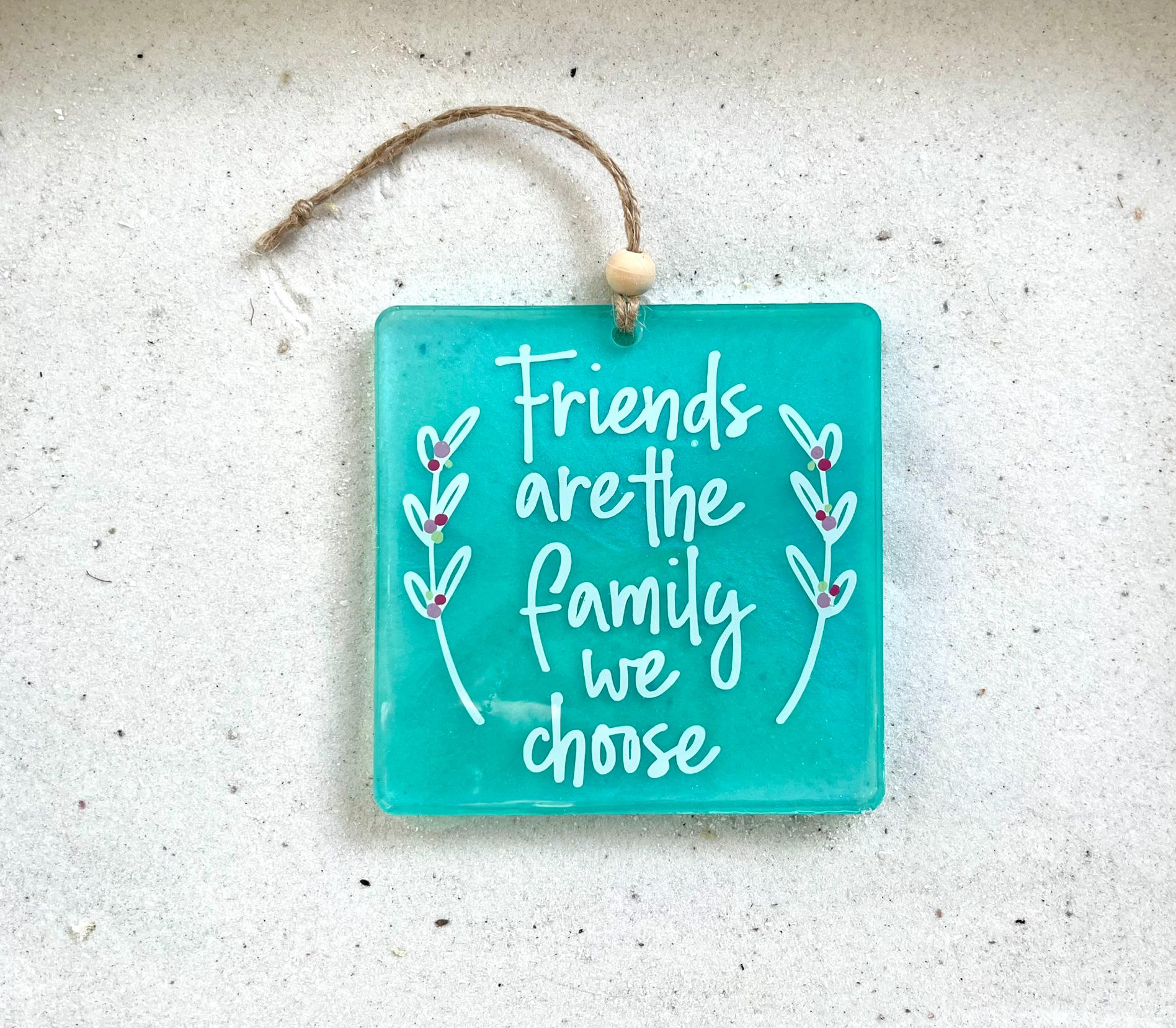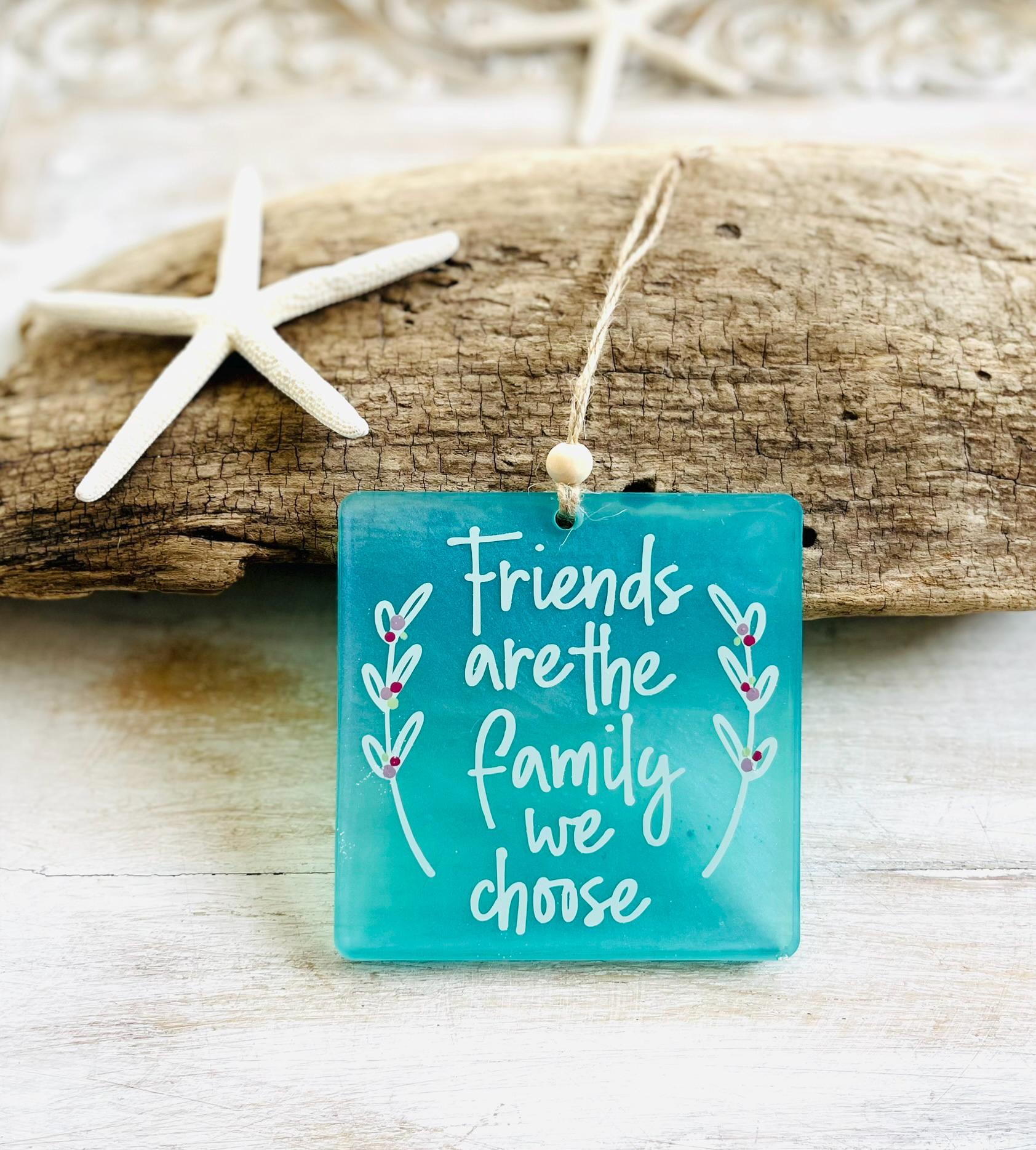 This friendship ornament makes a great gift for the holidays - fun for the Christmas tree but it can also be enjoyed year round. Each handmade piece measures 4" x 4" set on an aqua background, white lettering, hand painted floral accents and set in resin making it durable for years to come. A twine hanger with a wooden bead give each ornament a little beachy touch!