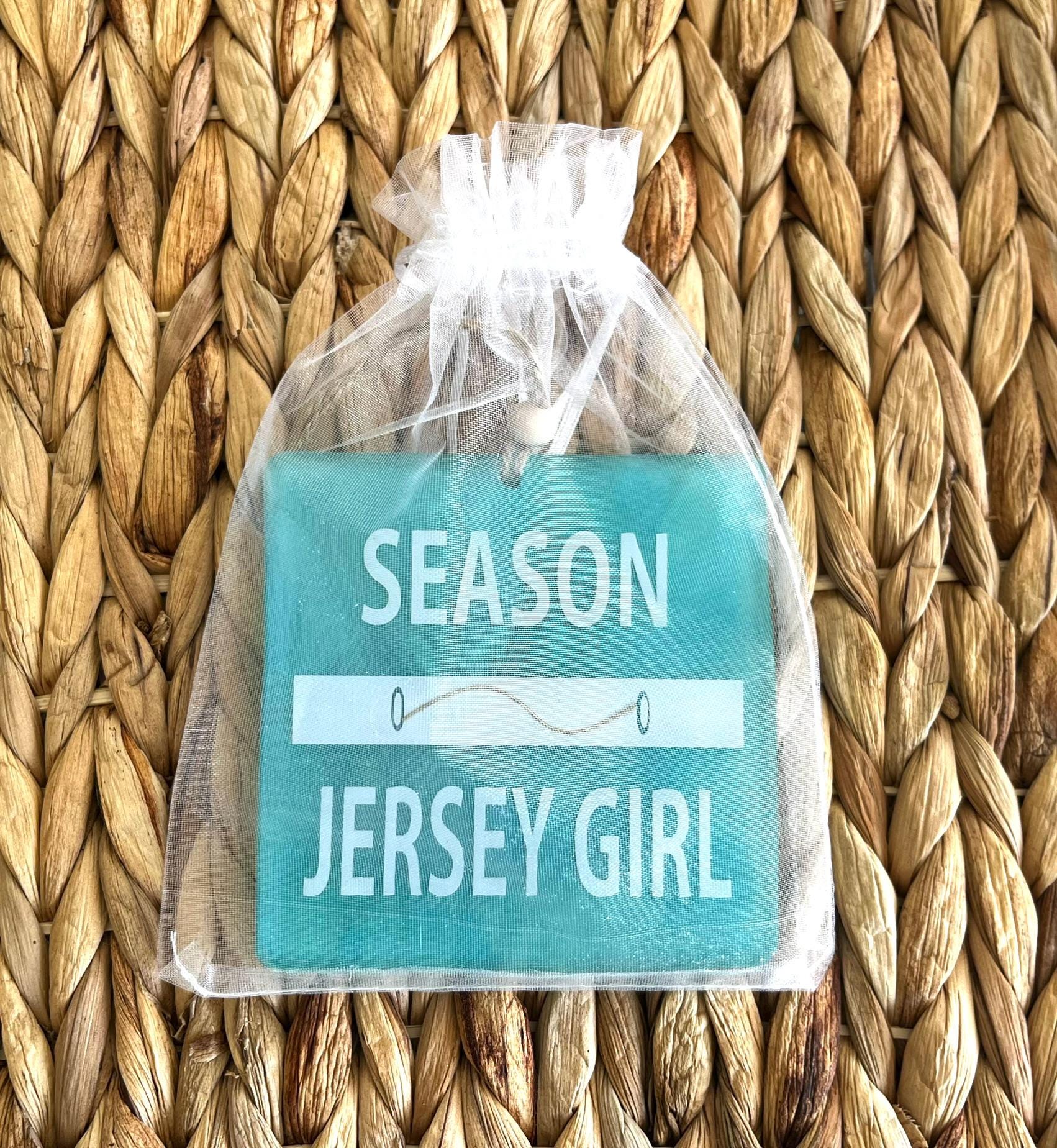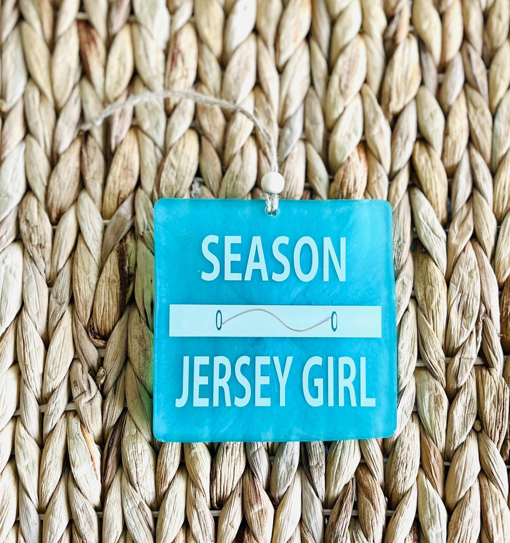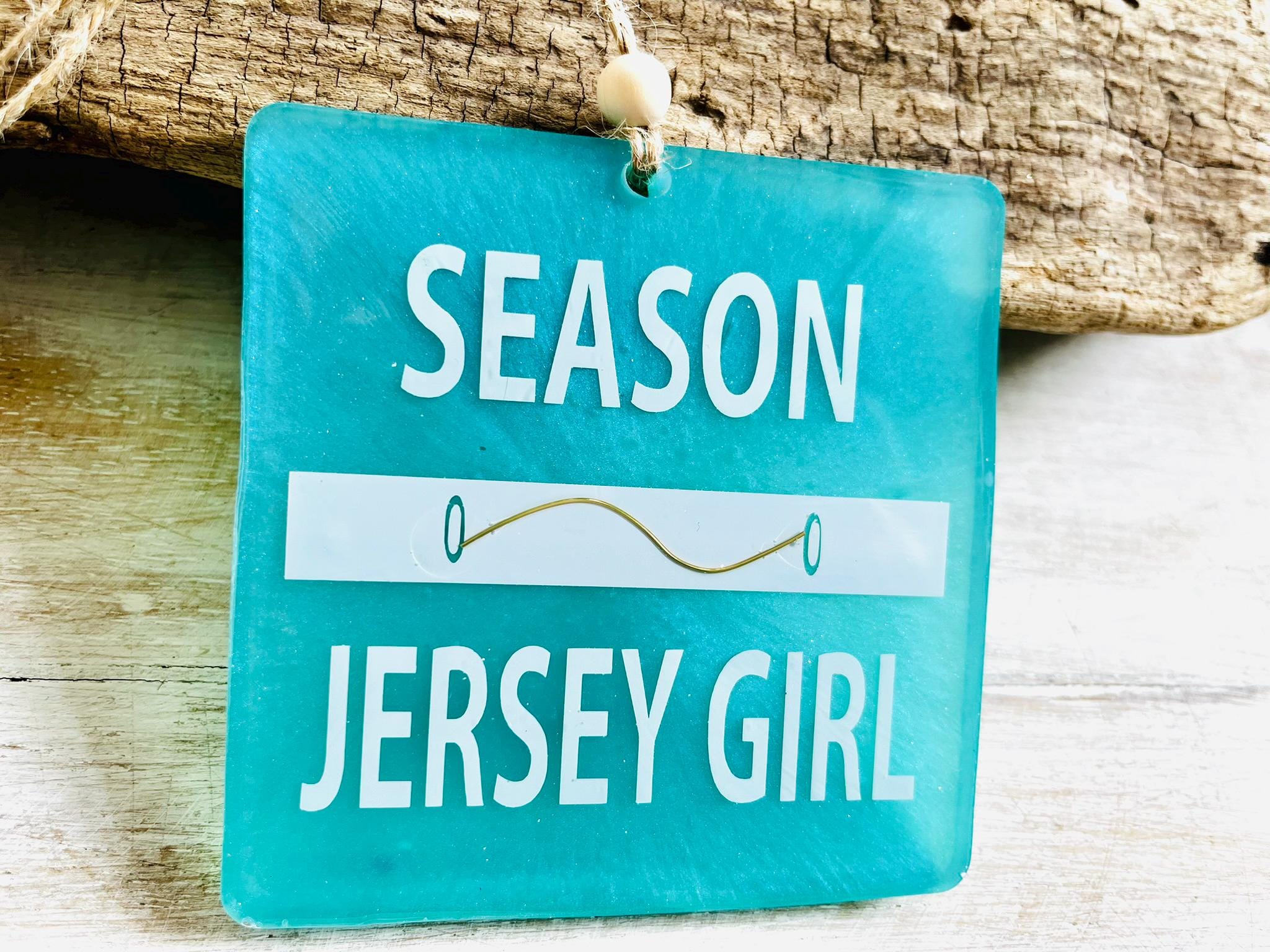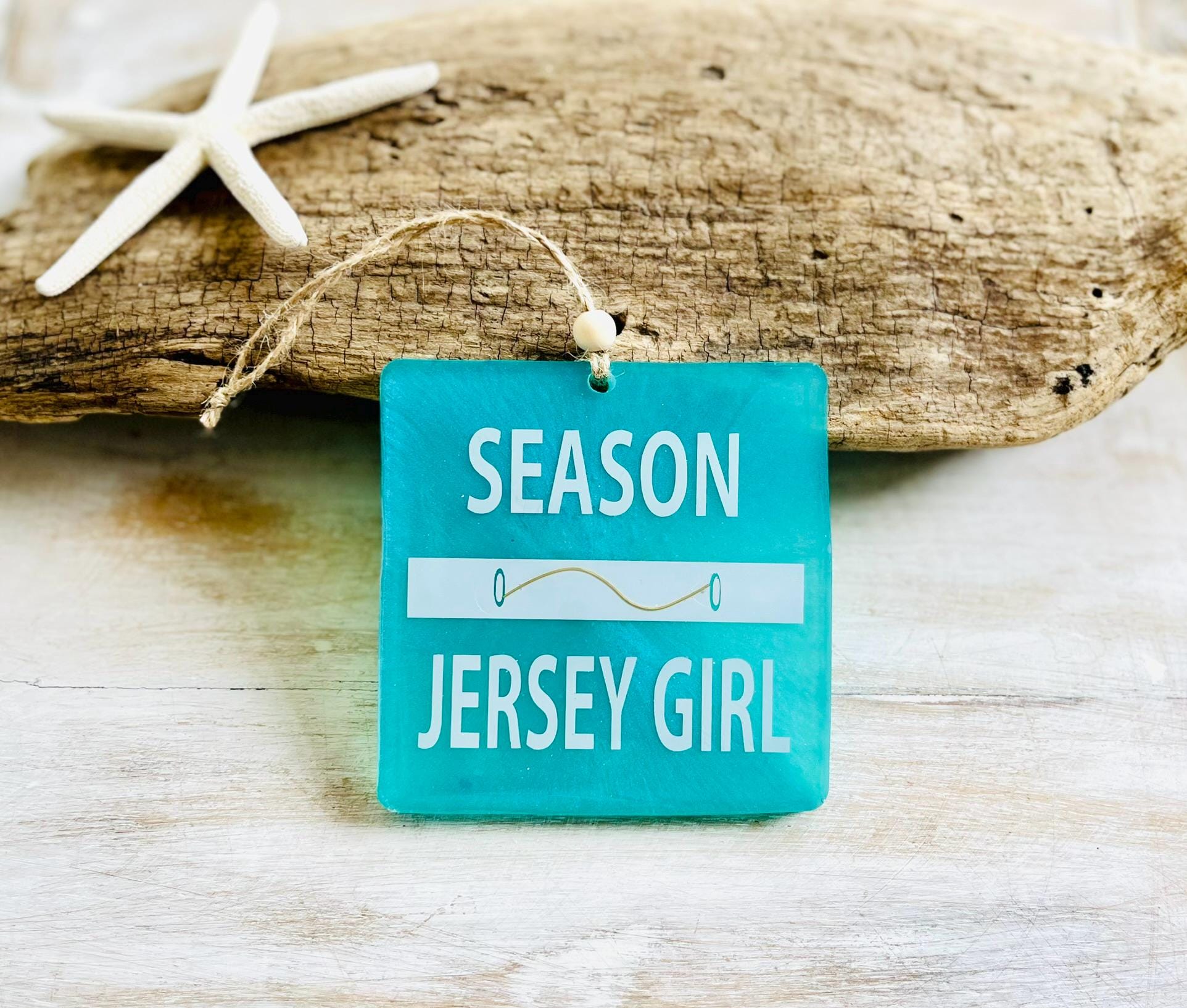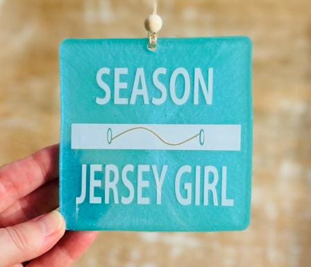 This Jersey Girl beach badge/beach tag ornament is perfect for the holiday Christmas tree or Hanukkah decor but can easily be enjoyed year round too. Each piece measures 4" x 4" and has white lettering on a gorgeous coastal blue background, a metal clasp detail has been added to mimic a real beach tag and there's twine for hanging with a wooden bead for an extra beachy touch!