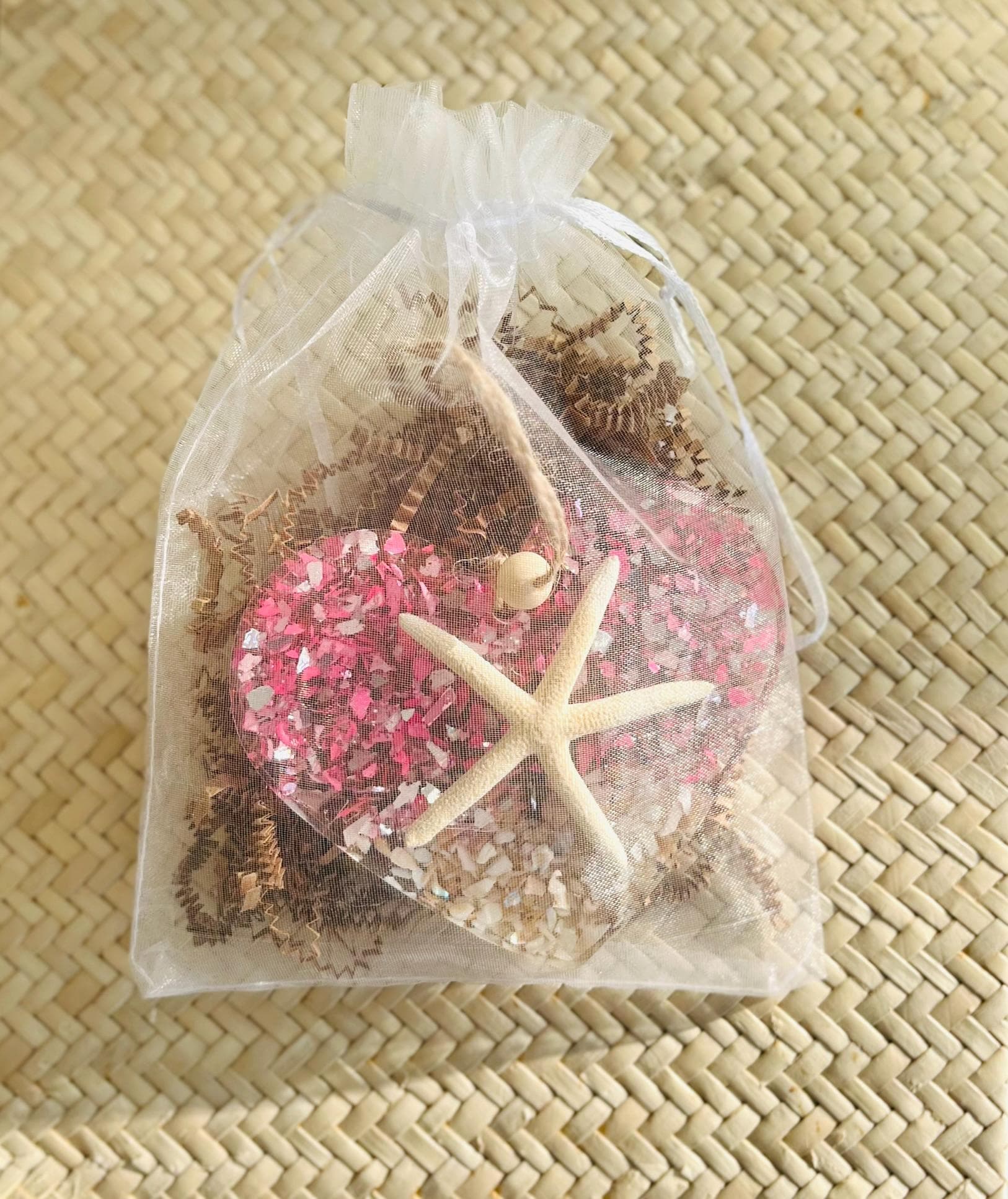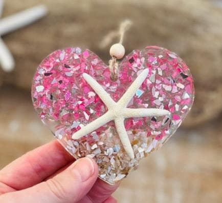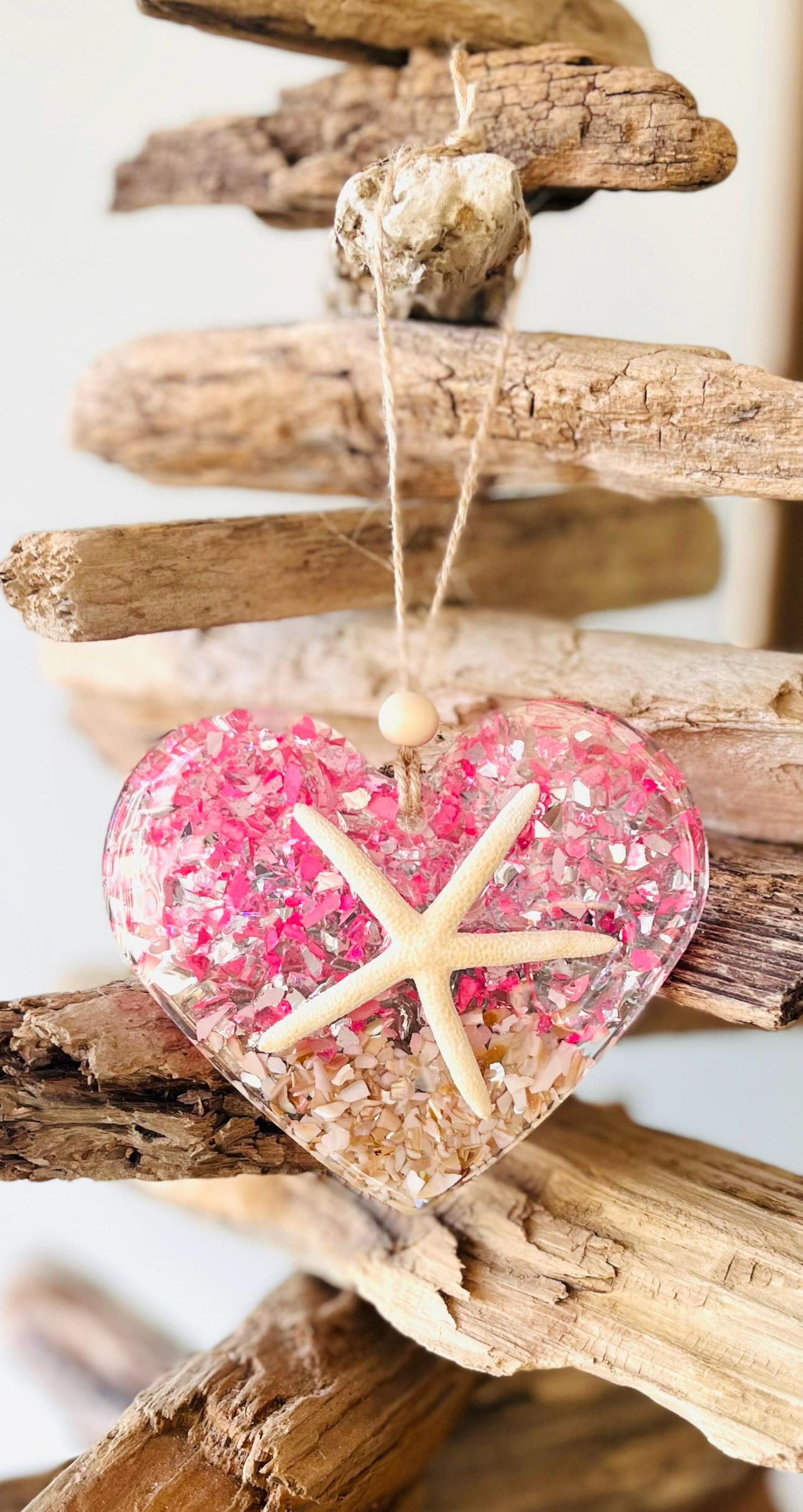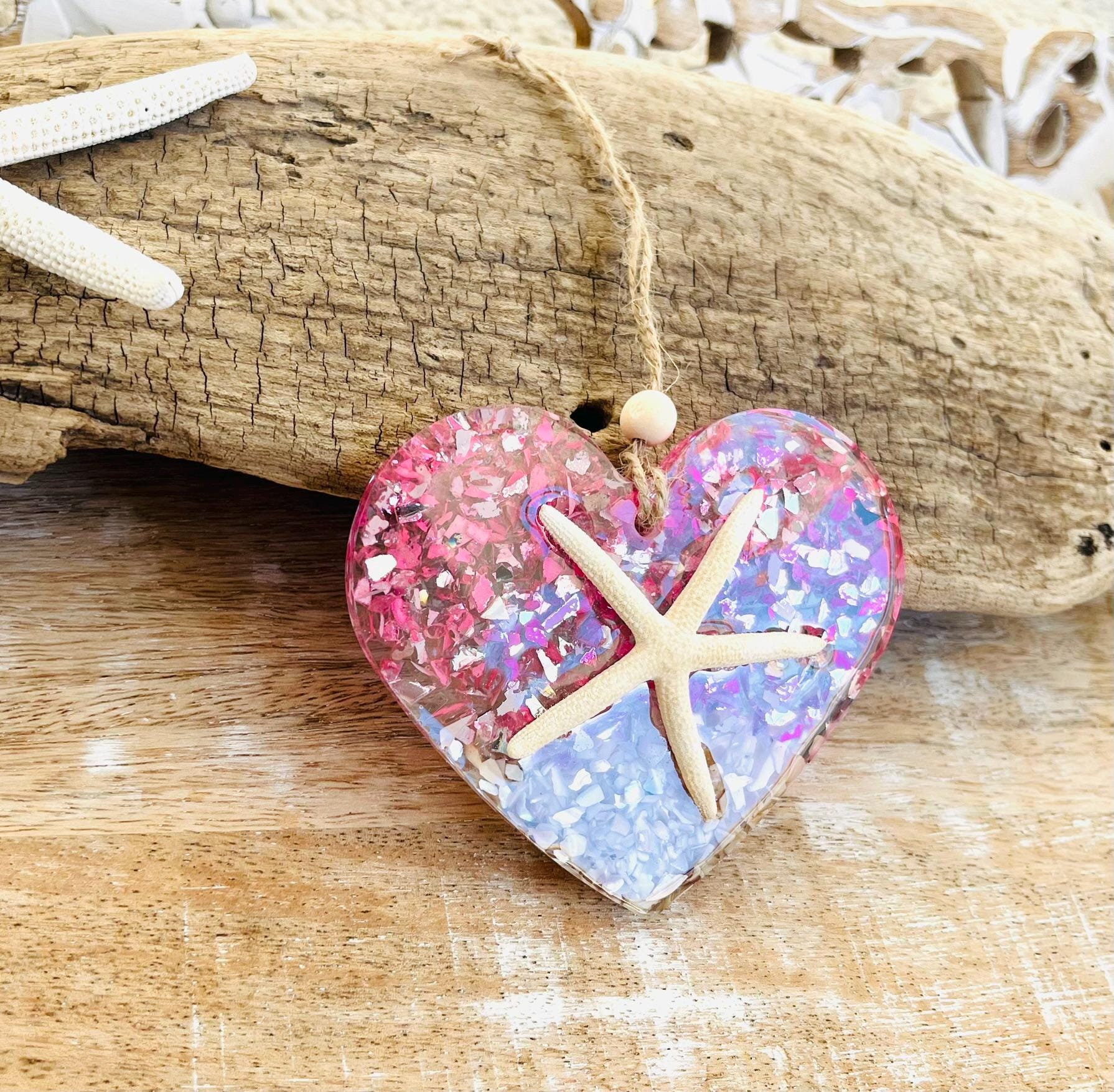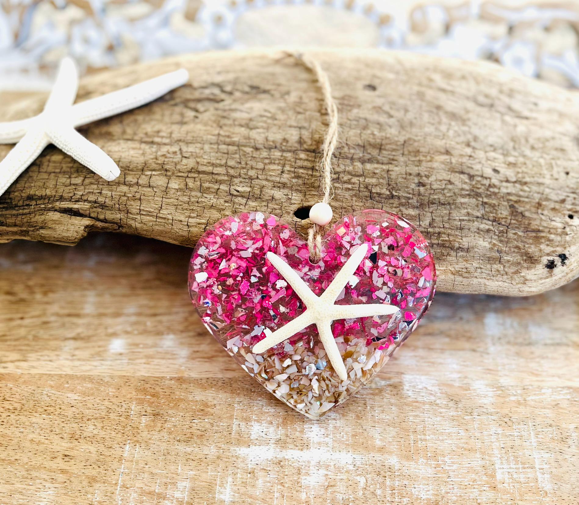 This handmade coastal heart ornament is made with bright flamingo pink crushed glass, sand, crushed shells, and a genuine starfish set in a 4" resin heart shape. A twine hanger and a wooden bead detail give it an extra beachy touch for your coastal Christmas tree for the holidays, for the Hanukkah season or simply enjoy as a sun catcher to be displayed year round.