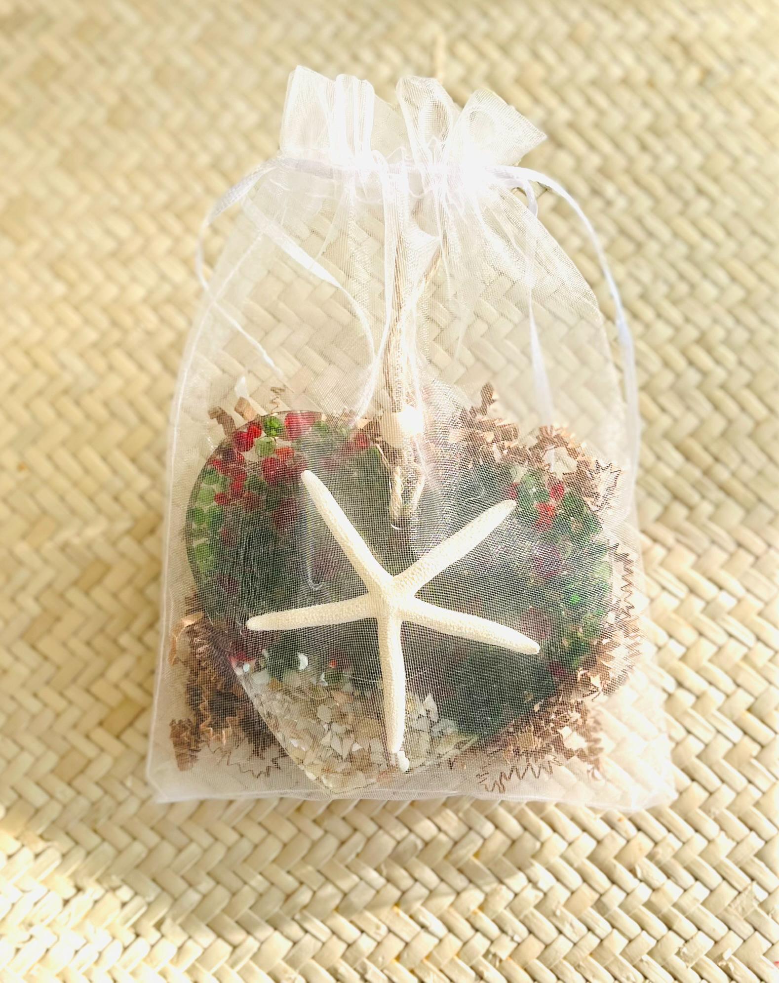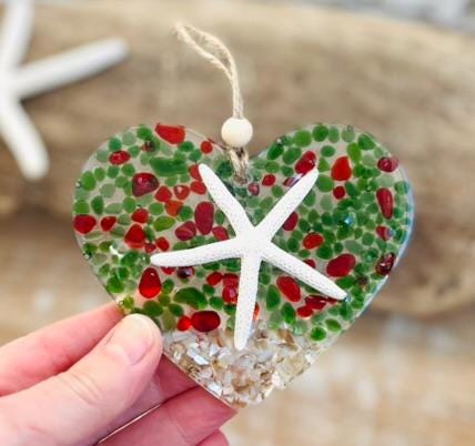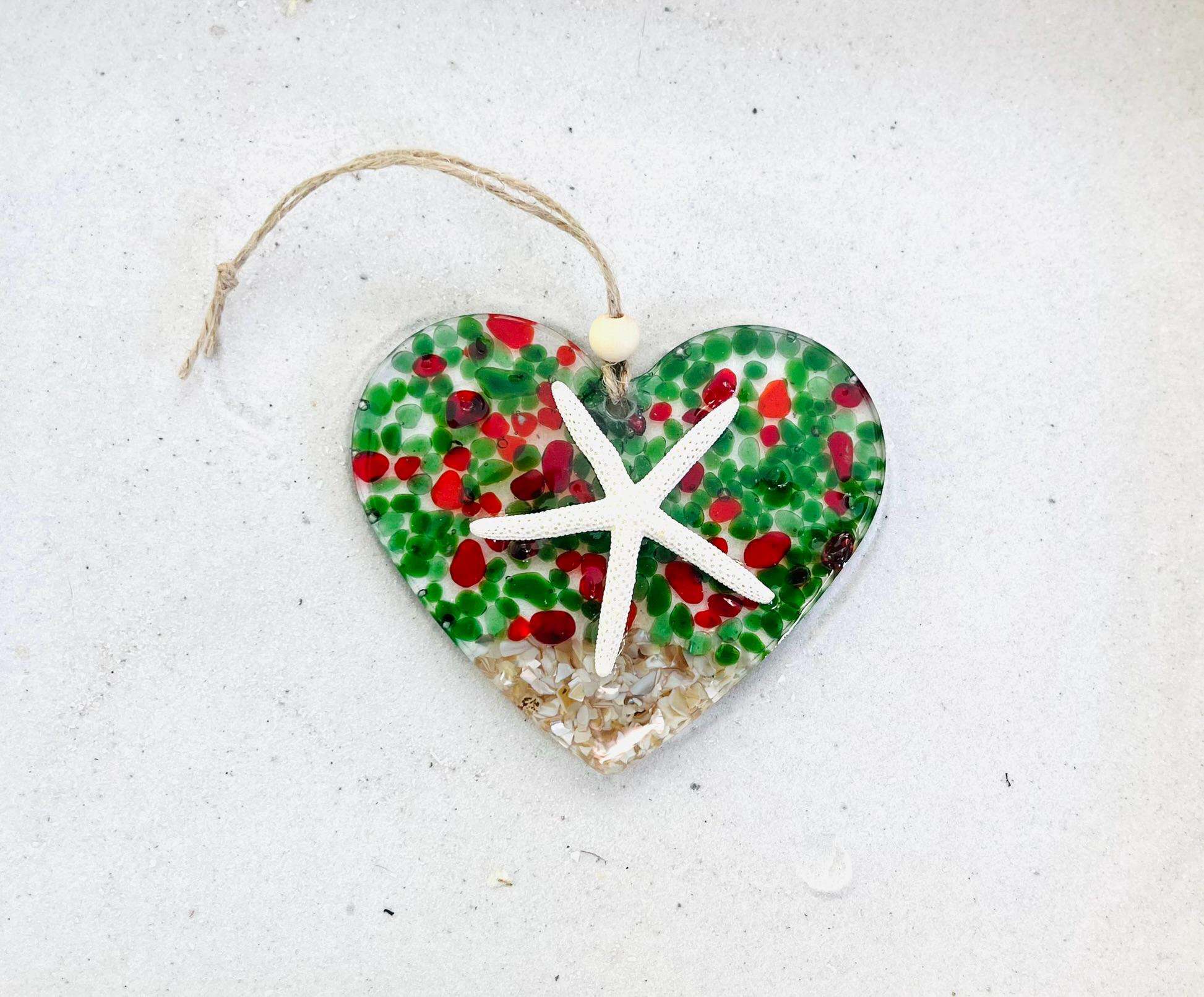 This handmade coastal heart ornament is made with red and green glass beads, sand, crushed shells, and a genuine starfish set in a 4" resin heart shape. A twine hanger and a wooden bead detail give it an extra beachy touch for your coastal Christmas tree for the holidays, for the Hanukkah season or simply enjoy as a sun catcher to be displayed year round.
