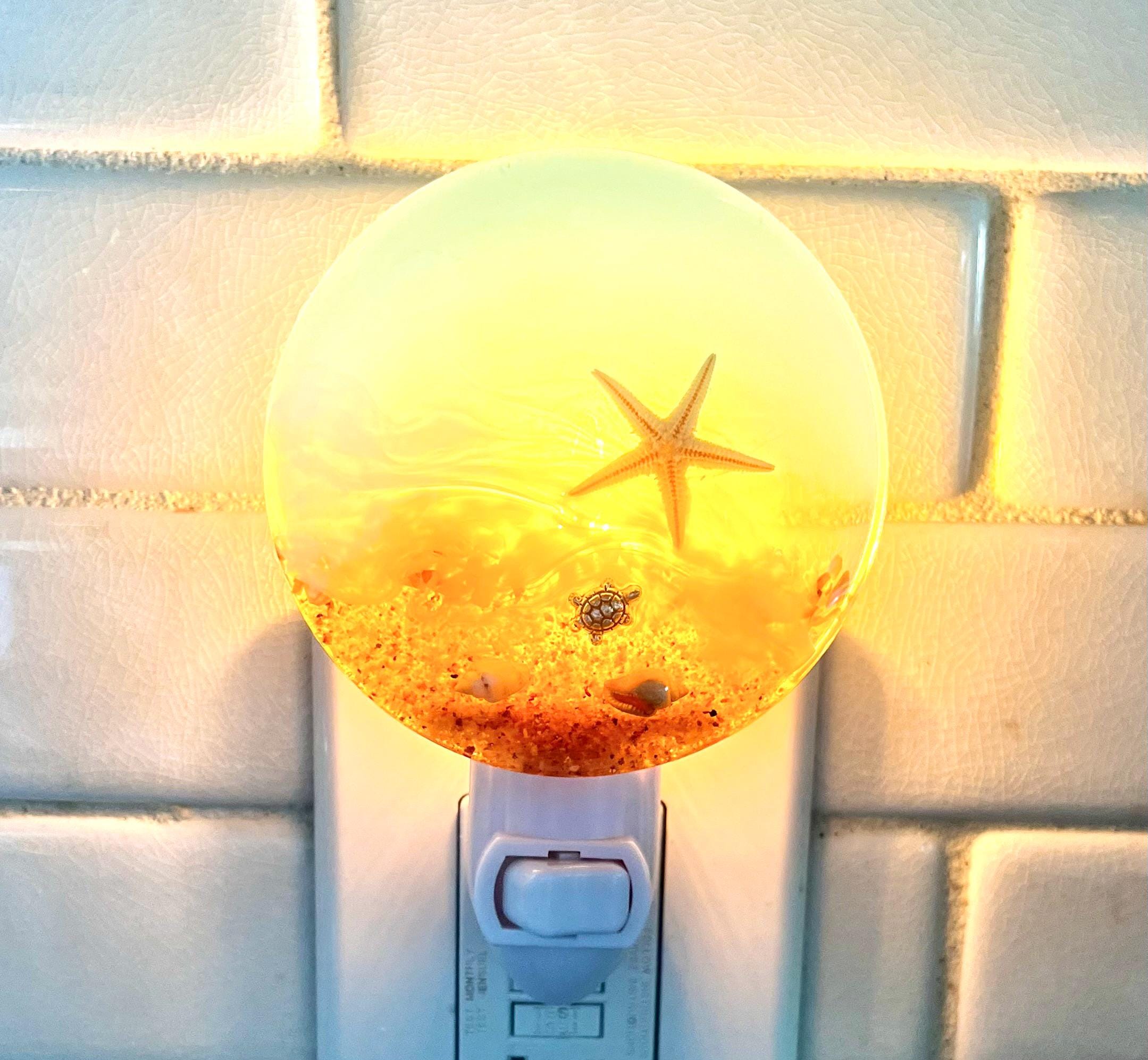 The light plugs into an outlet and has a switch and a 7 watt bulb - plenty of beautiful light without being too bright which is perfect for a bathroom, closet, nursery, hallway or any other nook. This beach night light is a fun addition to your coastal decor and makes a great hostess or housewarming gift for a beach or shore house.