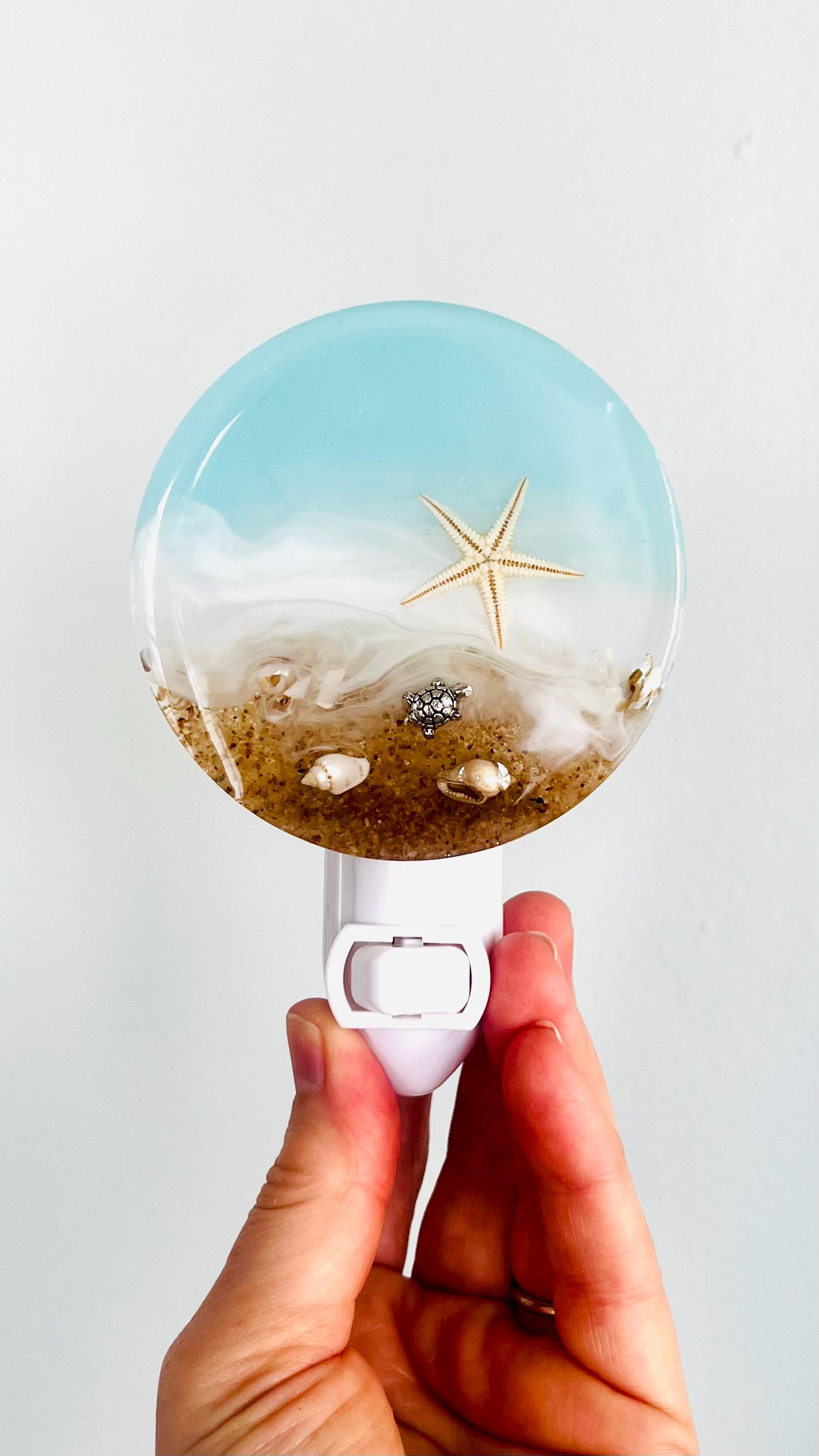 This beautiful sea turtle coastal ocean night light is made of gorgeous crushed shells, tiny shells, sand, and real starfish all set in resin. There is a sea turtle set in the beach scene along the resin waves. The design is a 3" x 3" square - the top of the night light to the bottom of the entire light measures 4.5" in height.