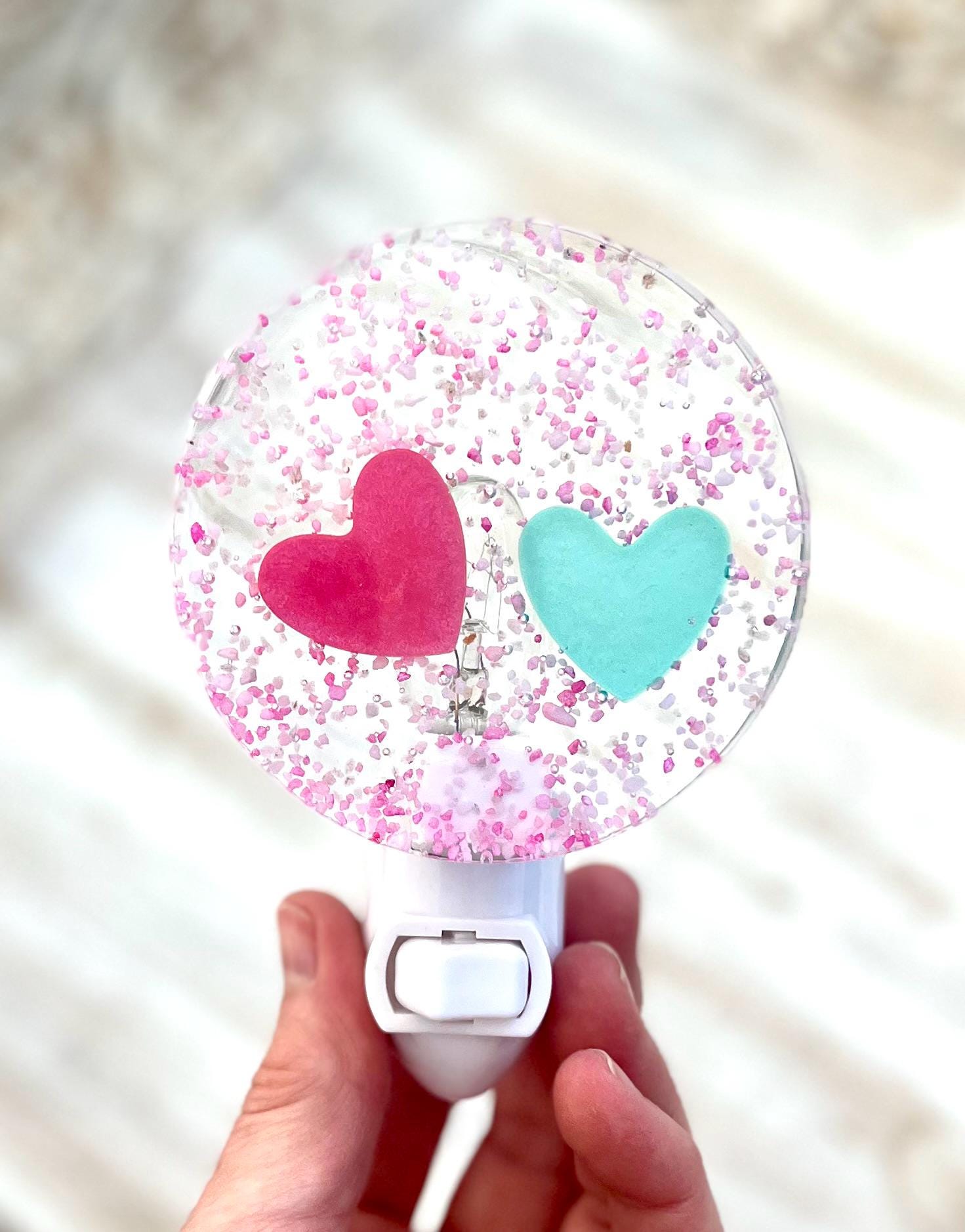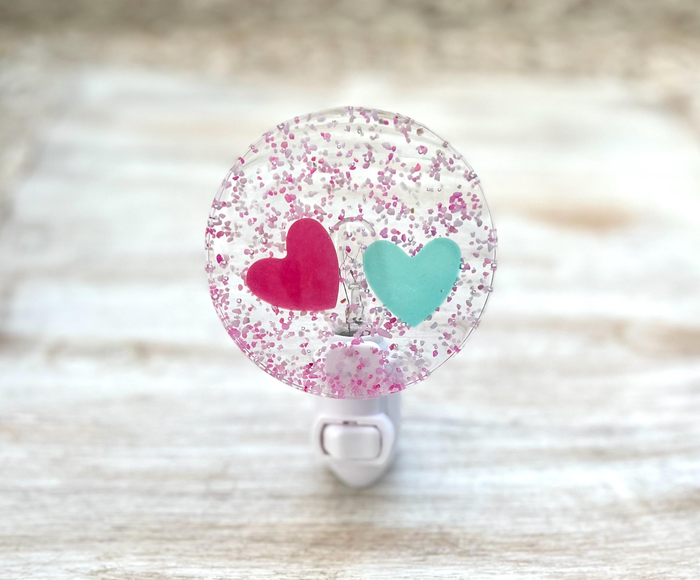 This beautiful handmade pink and aqua blue hearts night light is the perfect way to say I love you. Each piece has two hearts surrounded by flecks of light pink and dark pink sand which is then set in resin making the night light sturdy and durable.