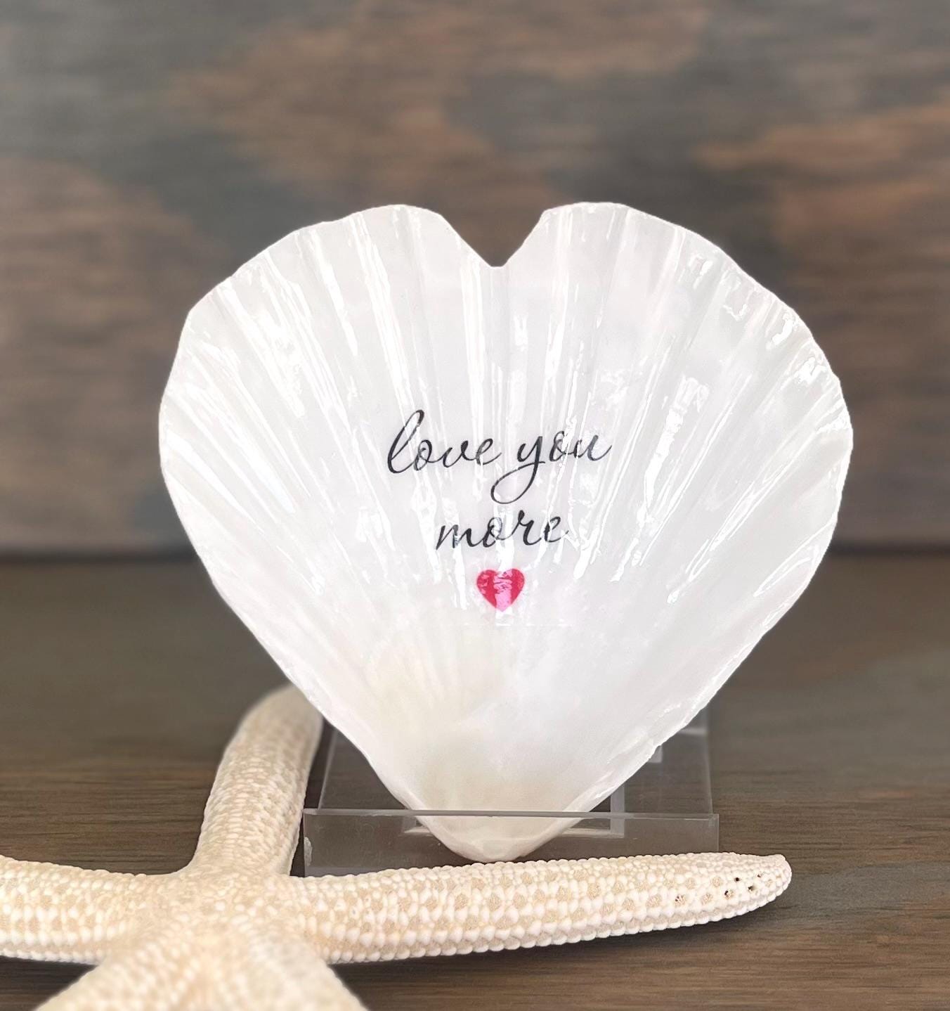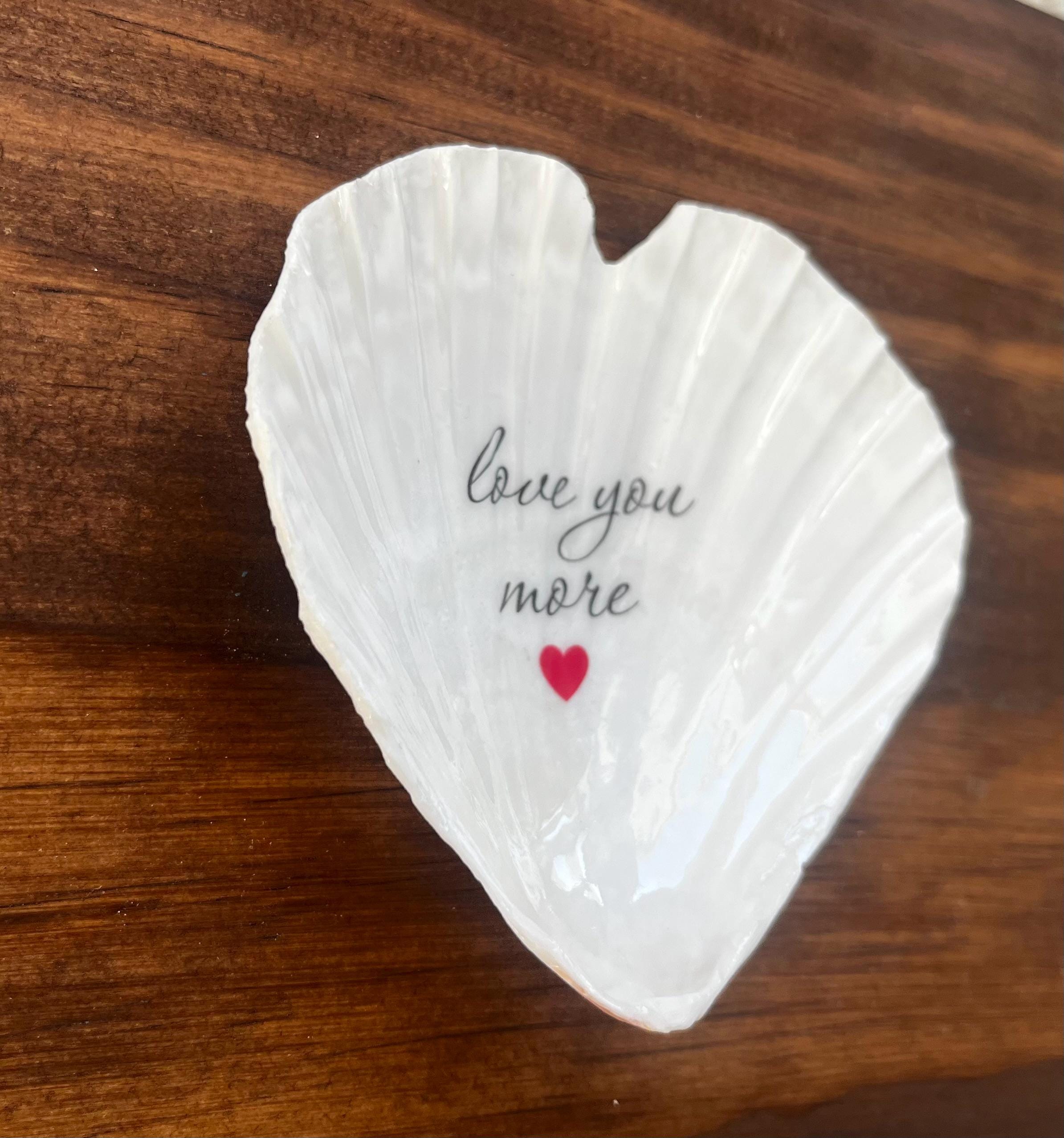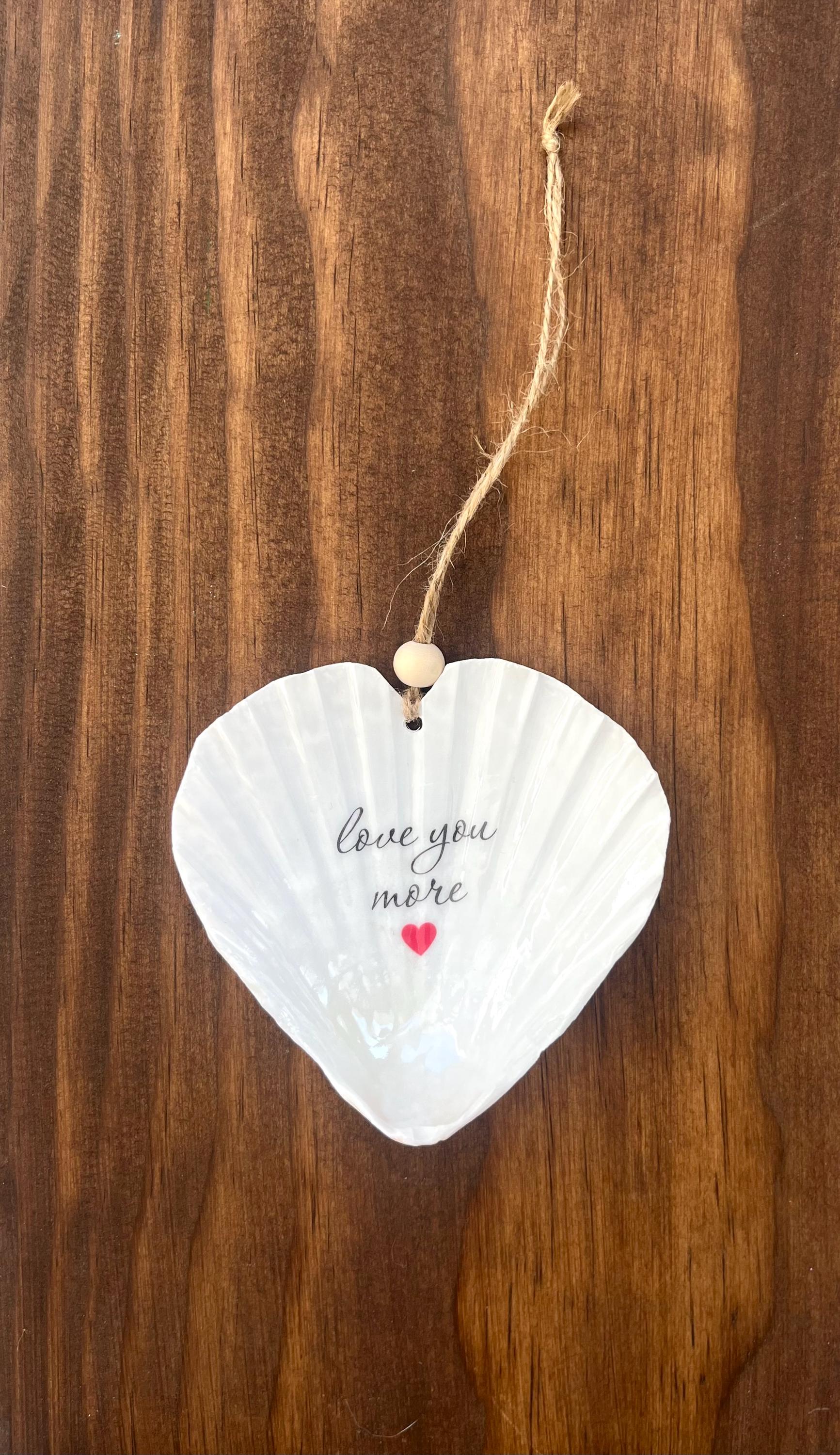 This Valentine's Day shell ornament is such a pretty way to say I love you. Each handmade item is made using a heart shaped scallop shell with the phrase "love you more" with a red heart. You can choose to have this with no hanger if you want to prop it up on a shelf or use a small stand (not included) or you can choose to have a twine hanger added. The twine hanger has a wooden bead to give the ornament an extra beachy touch!