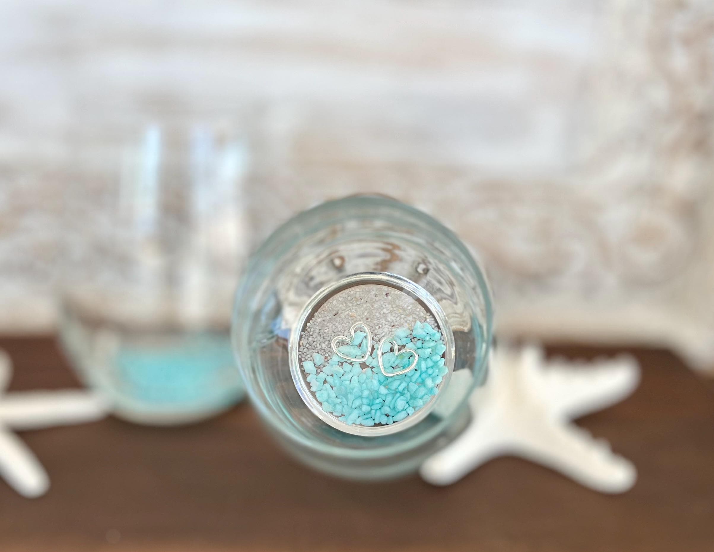 Each stemless wine glass is crafted with sand, blue stones, and two silver heart gems all carefully arranged to look like a beach shoreline. The coastal scene is set in resin and food safe for enjoying with your favorite cold drink. Each glass is individually handmade and slight variations make each one unique.
