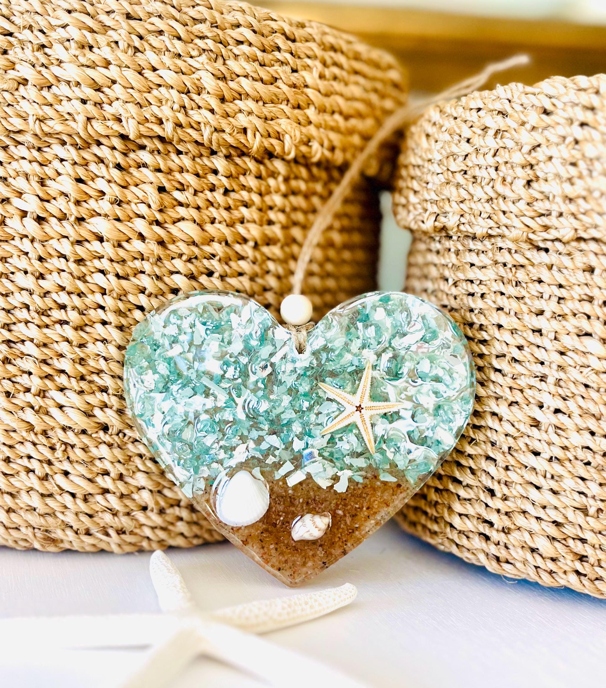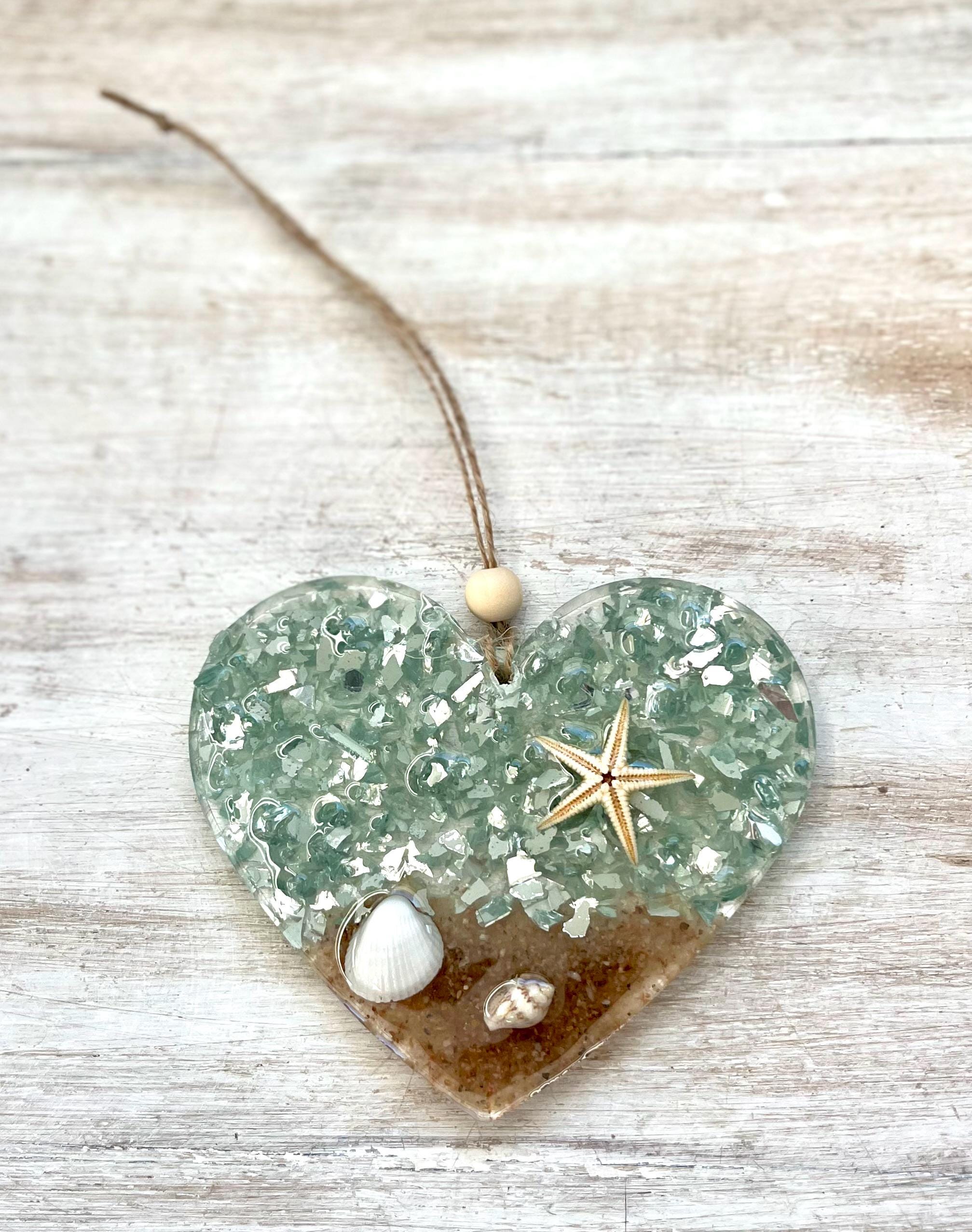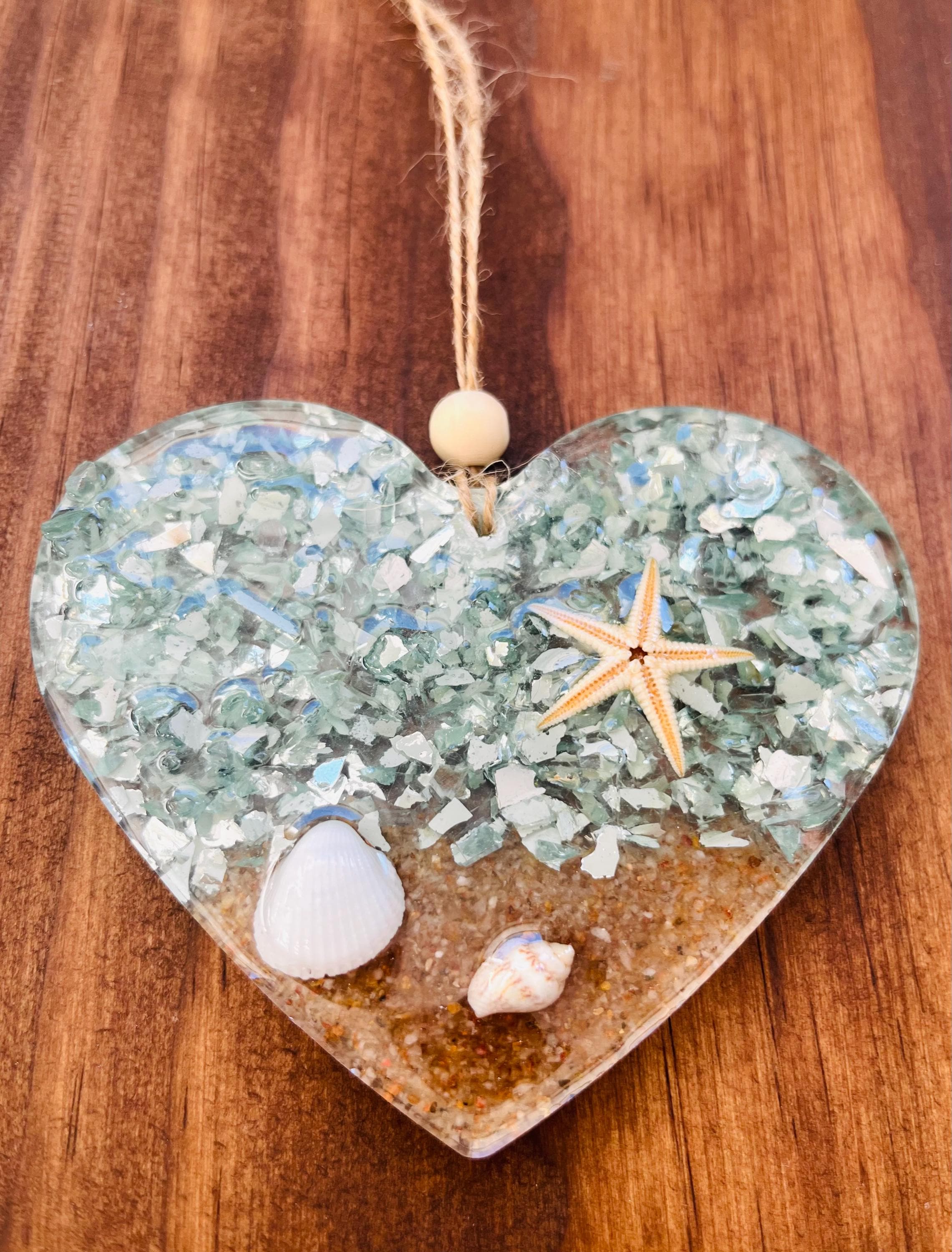 This resin heart ornament makes a unique gift for Valentine's Day, an anniversary, birthday, Mother's Day or even a wedding. Each handmade piece consists of sand, light aqua crushed glass, tiny seashells and a genuine starfish set in a 4" resin heart shape. A twine hanger and a wooden bead detail give it an extra beachy touch. A fun addition to your coastal Christmas tree for the holidays, for the Hanukkah season or simply enjoy as a sun catcher to be displayed year round.