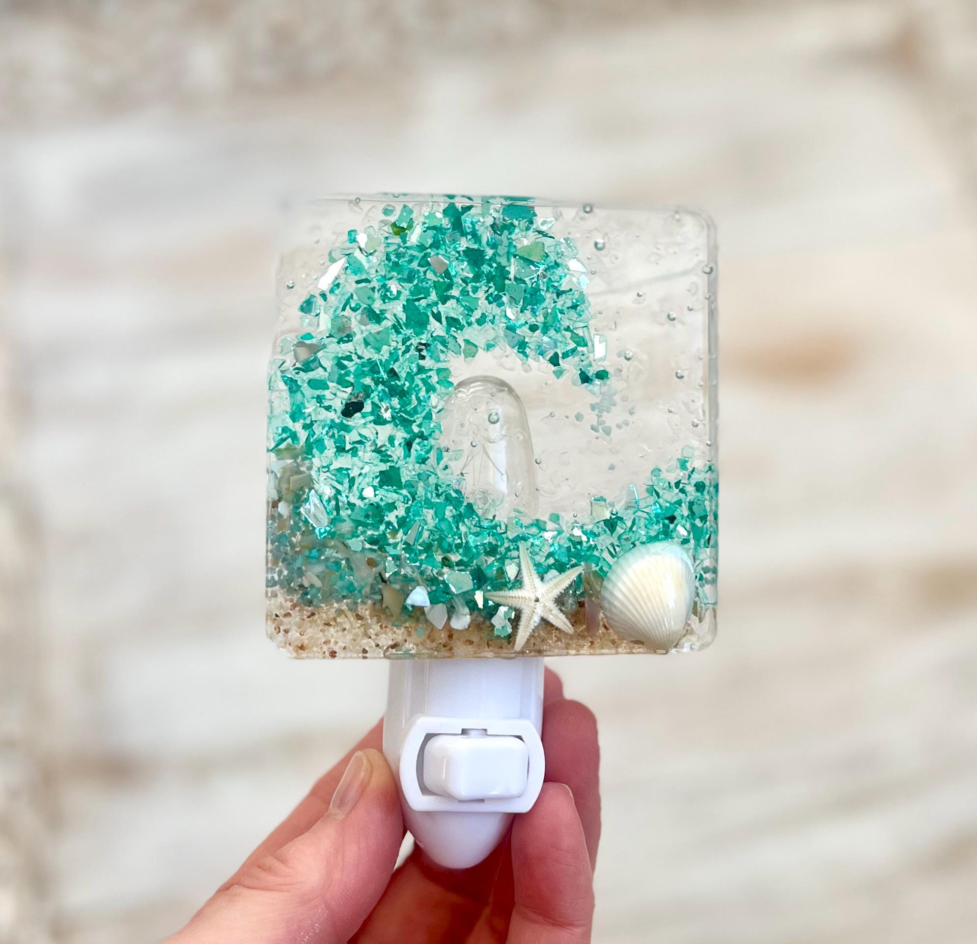 This beautiful coastal ocean wave night light is made of gorgeous bright aqua crushed glass, tiny shells, sand, and real starfish all set in resin. The resin wave design is a 3" x 3" square - the top of the night light to the bottom of the entire light measures 4.5" in height.