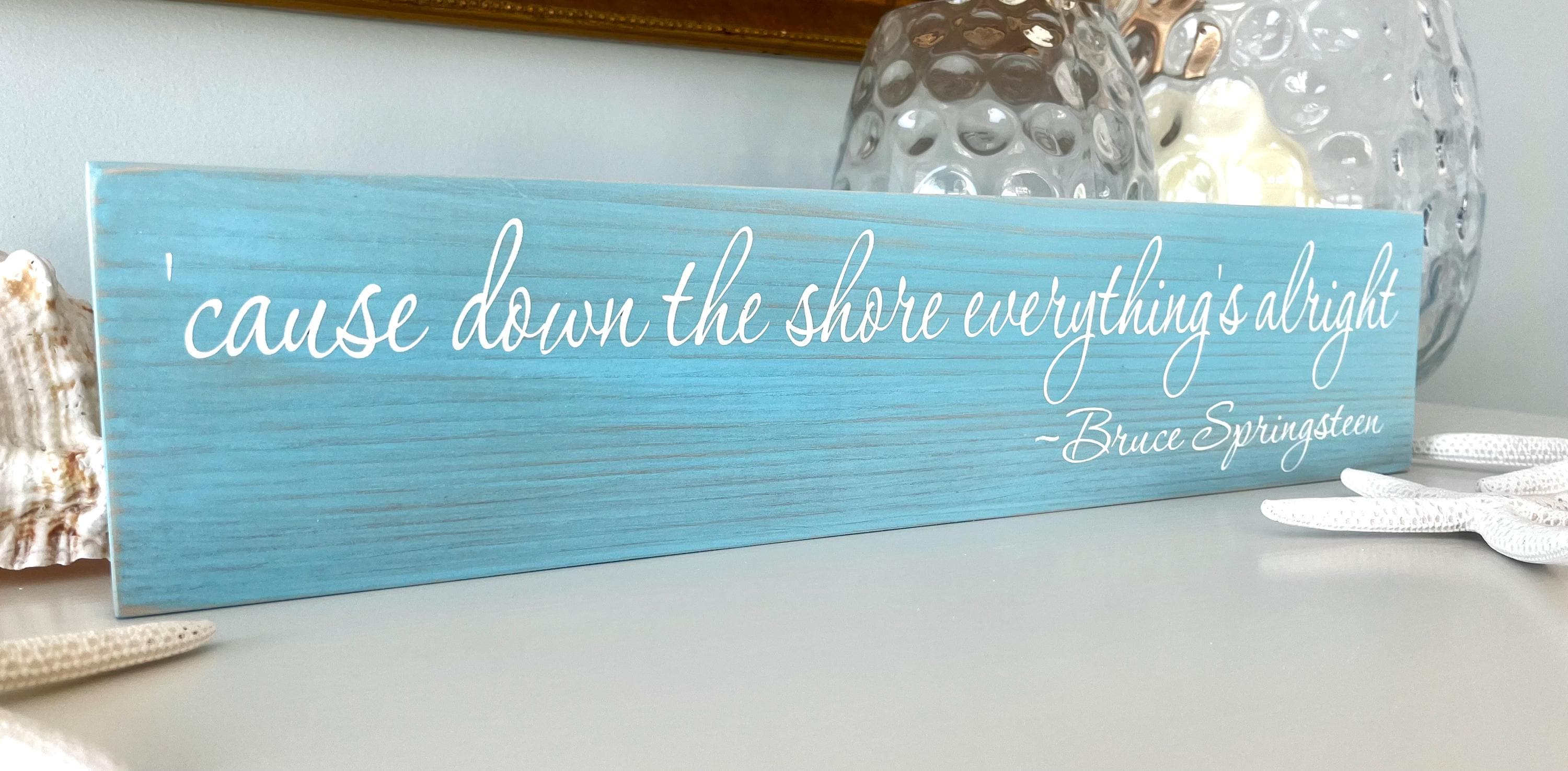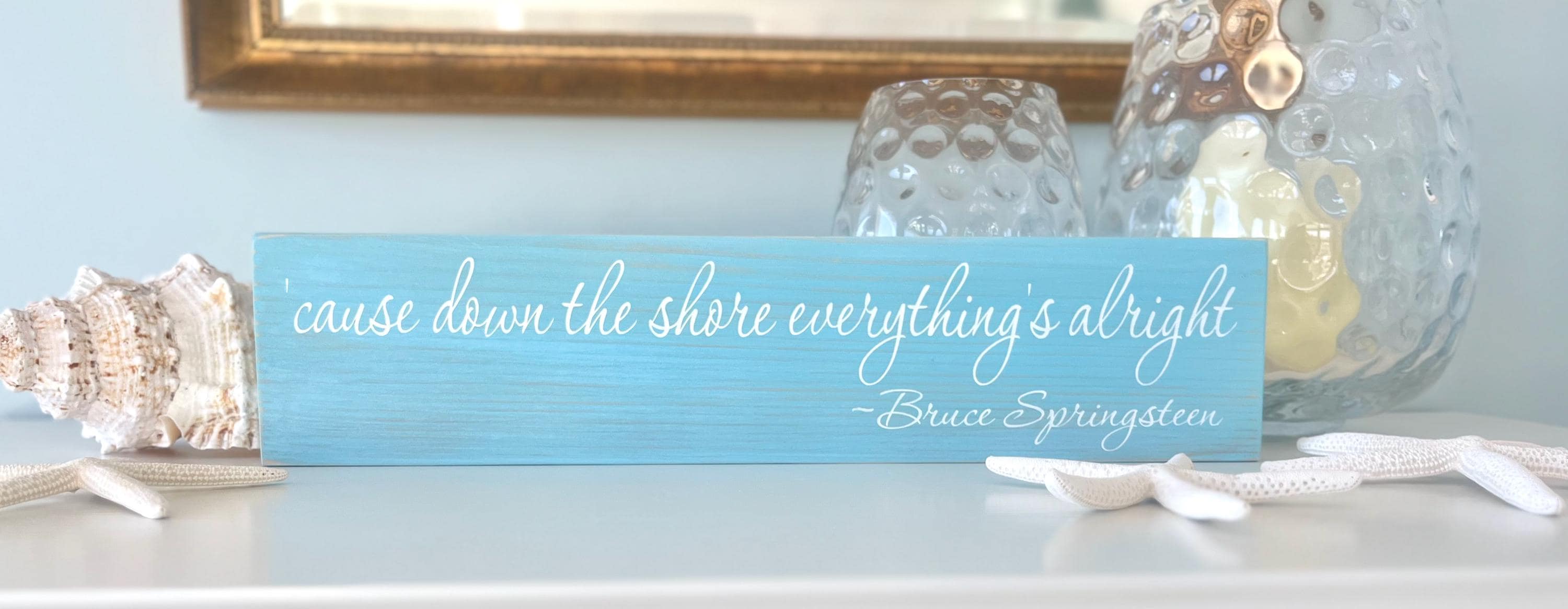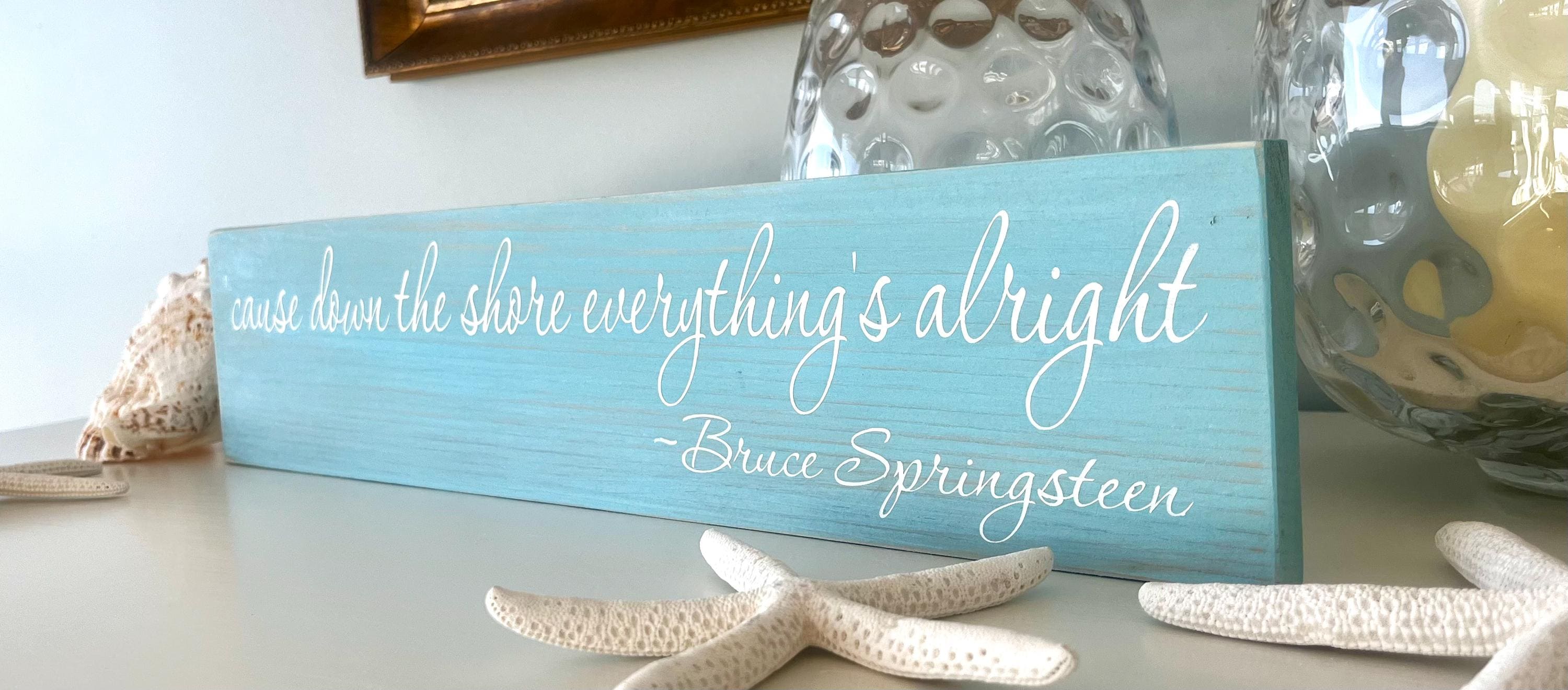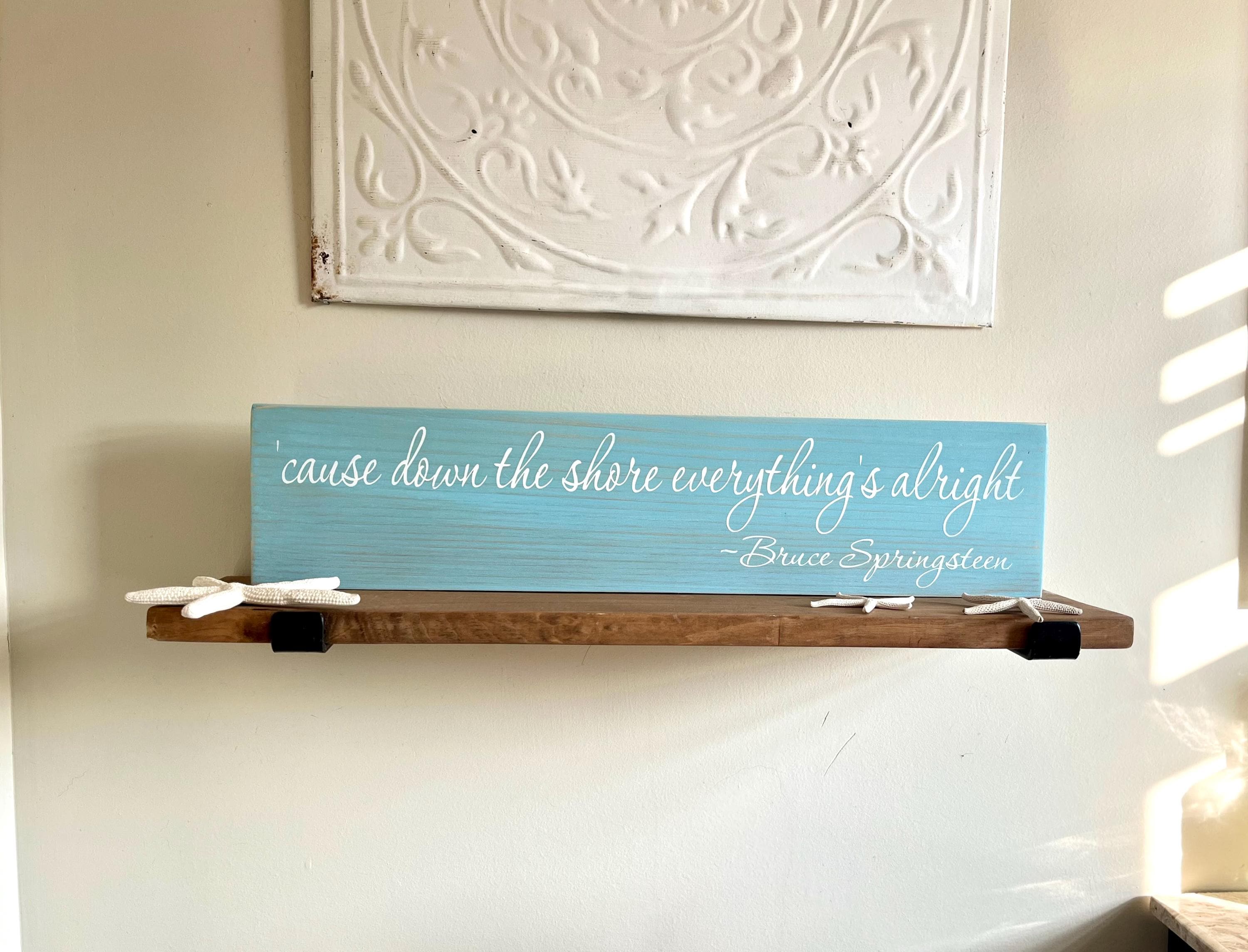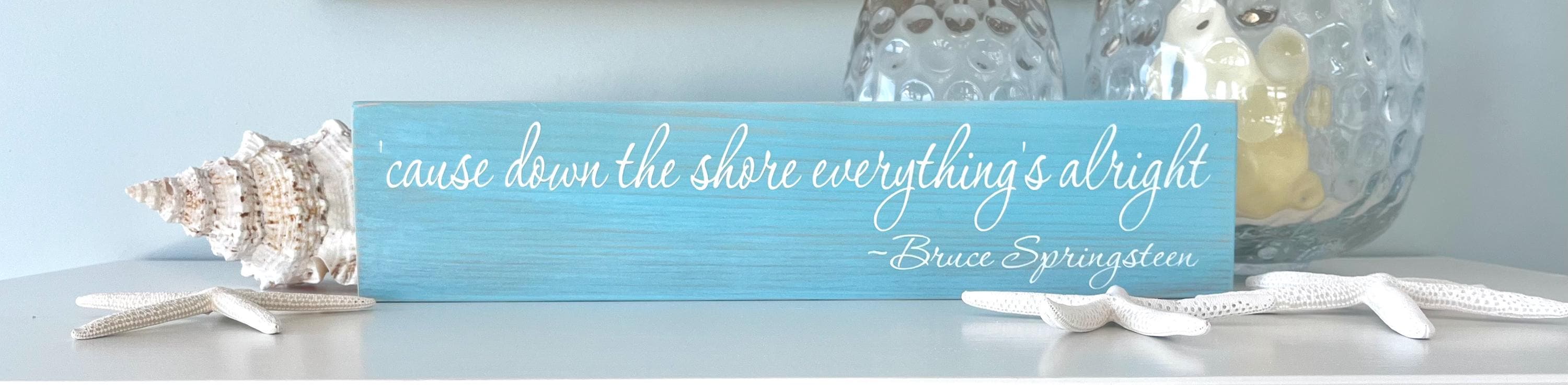 This wooden " 'cause down the shore everything's alright ~ Bruce Springsteen " sign shown on an aqua blue stained board with white painted lettering - a beautiful and unique blend of colors perfect for your coastal home decor. The sign measures 20" wide by 4.5" high and is 3/4" thick which is a nice, versatile feature because it is thick enough to stand on it's own on a shelf, dresser, ledge or any other flat surface or you can simply hang up with the attached sawtooth hanger on the back. Each sign is stained, painted, and then lightly distressed to give it an extra beachy look.