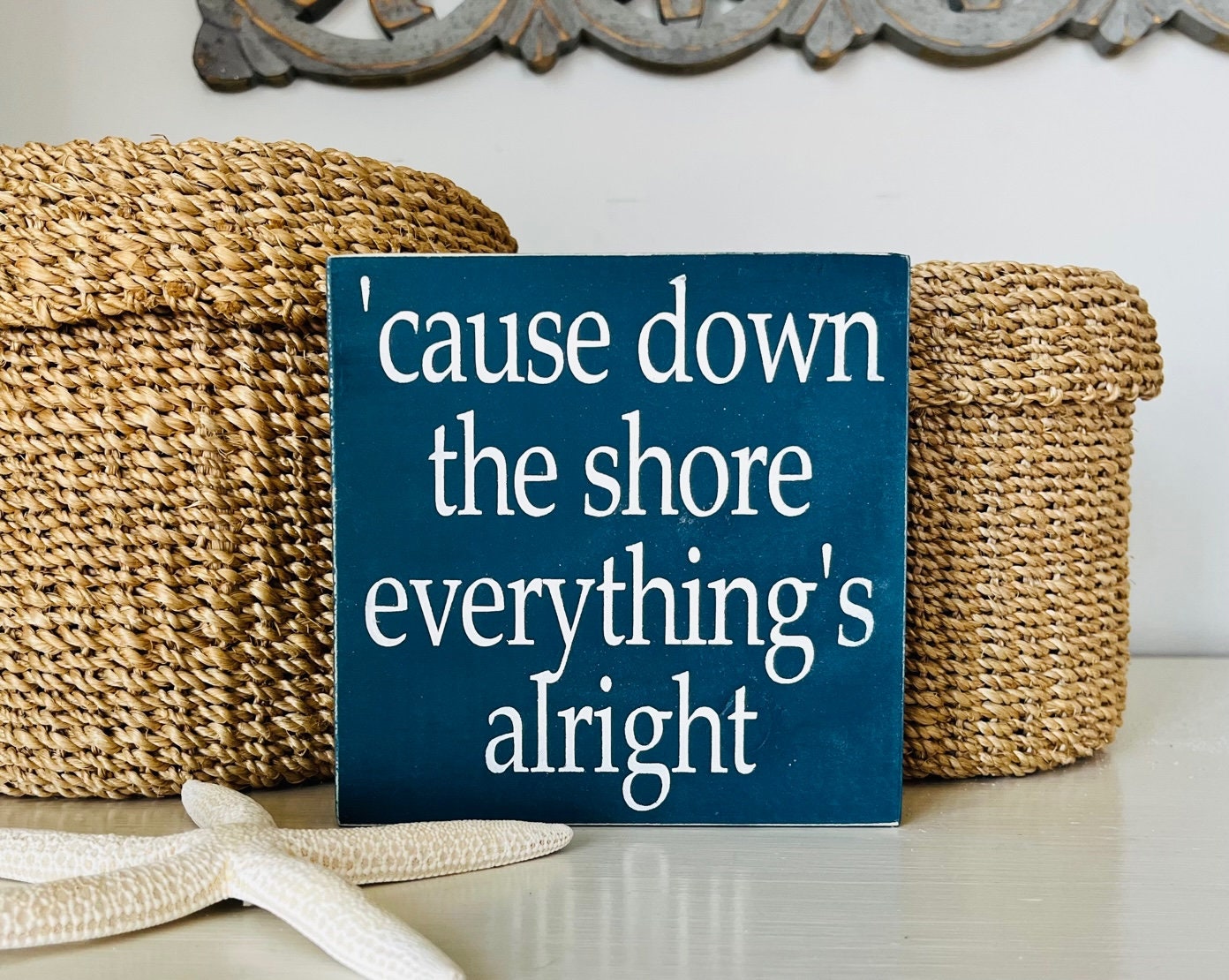 This 'cause down the shore everything's alright wood beach sign is painted navy with white painted lettering and is lightly distressed to give it a beachy look. This ready to ship sign measures 5.5" x 5.5" and has a sawtooth hanger on the back for easy wall hanging or you can simply prop it up on a shelf, desk, dresser or any other flat surface.