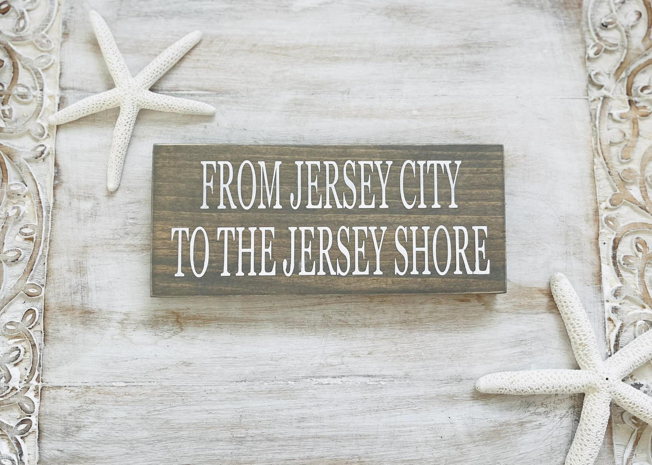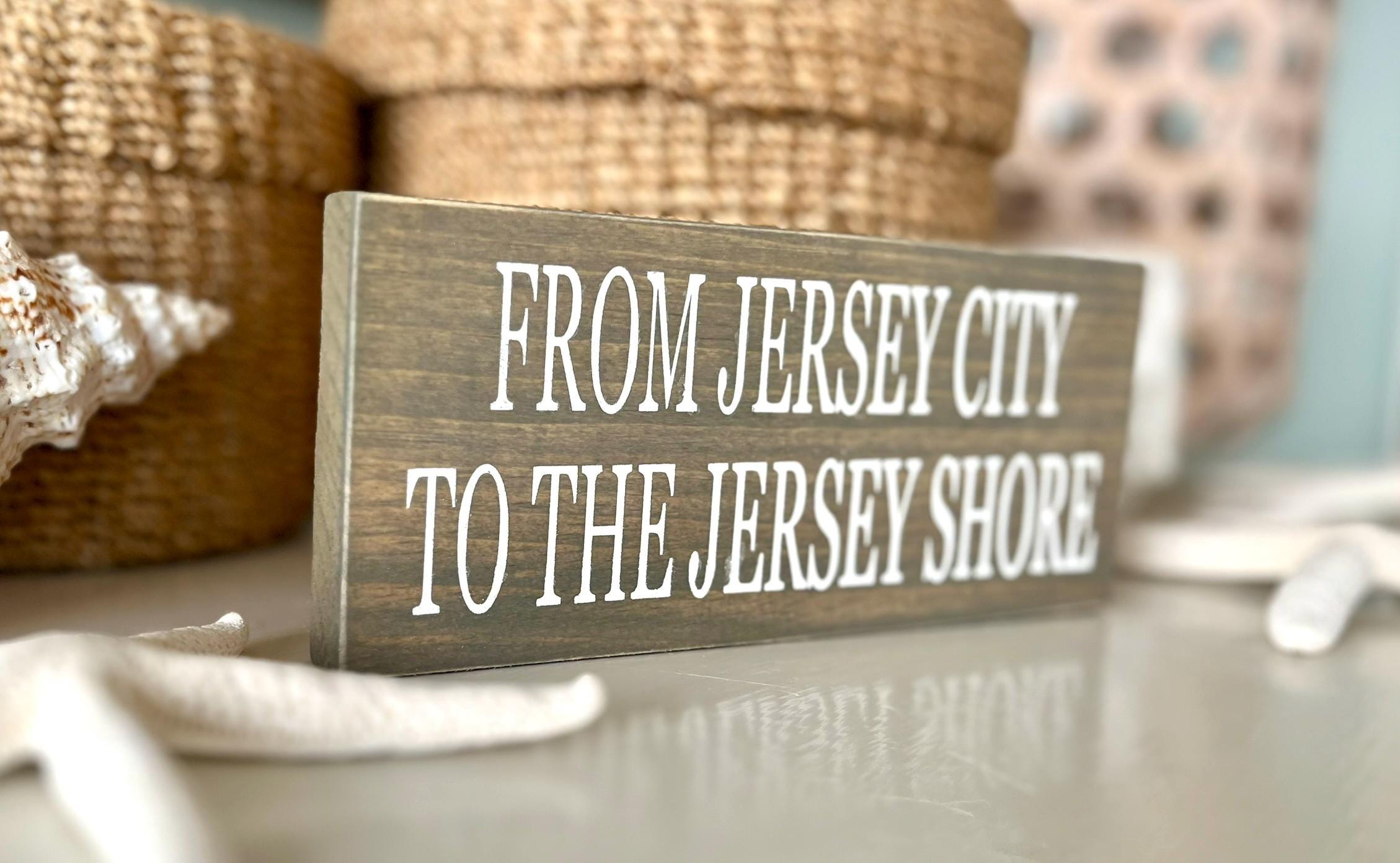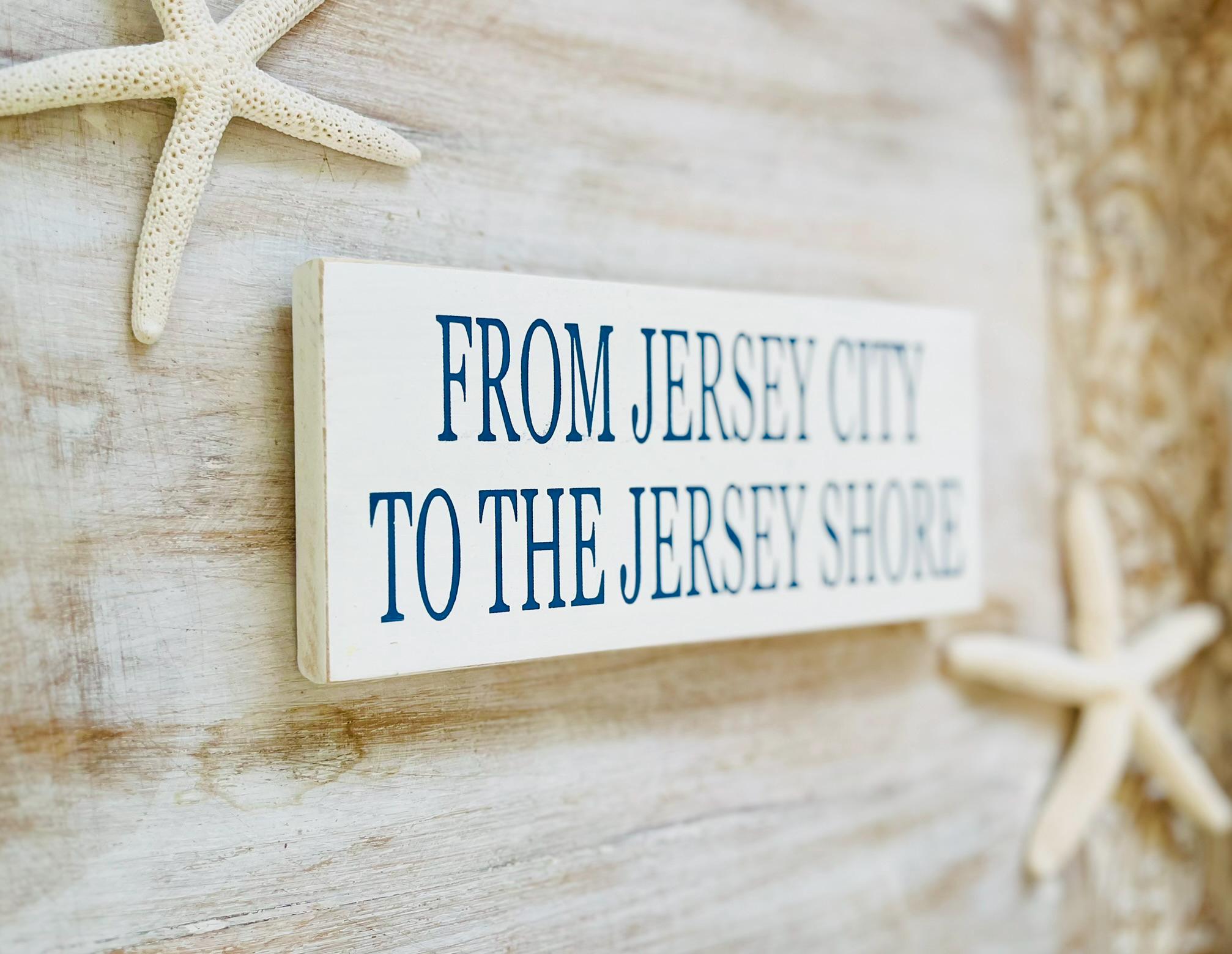 This fun "From Jersey City To The Jersey Shore" wood sign is available in two color options and is ready to ship! These signs measure 8" wide by 3.5" high and have a sawtooth hanger on the back for easy wall hanging or simply prop up on a shelf. Since these are 3/4" thick they make great shelf sitters - they stand easily on their own on any flat surface such as a shelf, ledge, dresser etc. and it's easy to find a nook in your home for these signs.