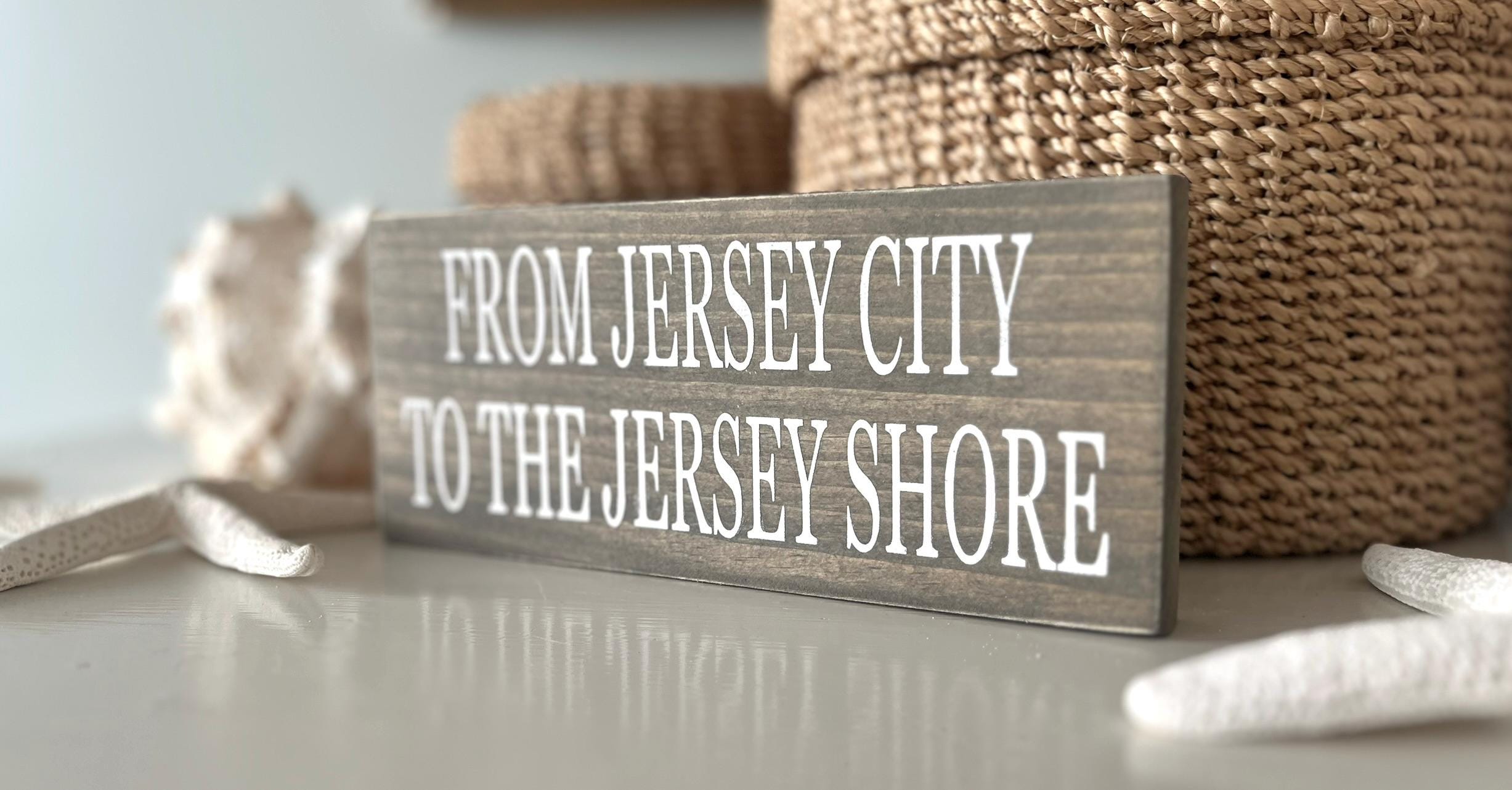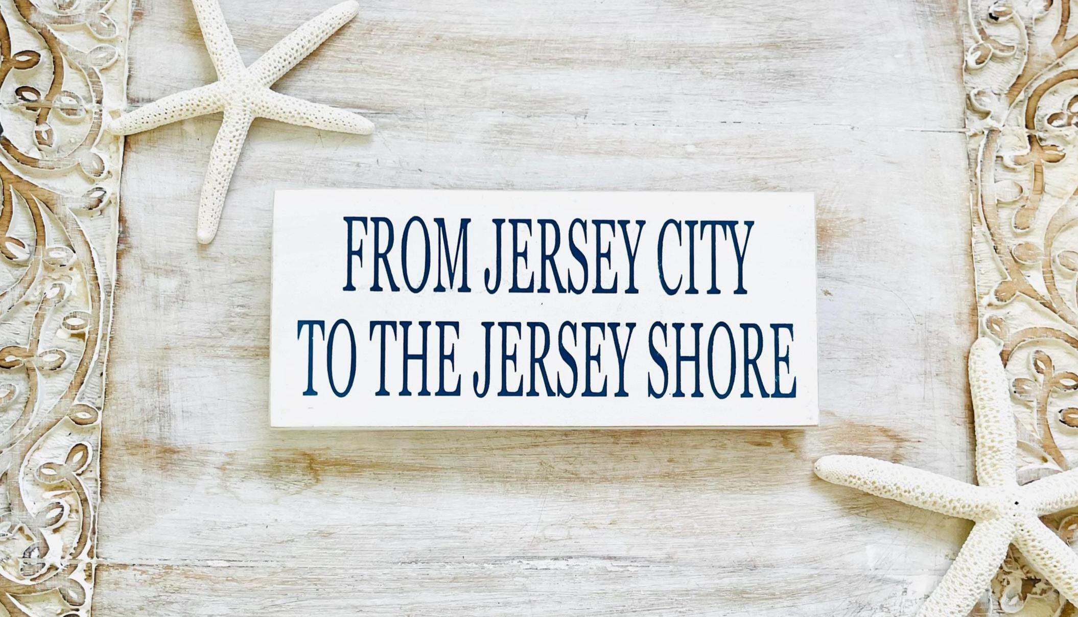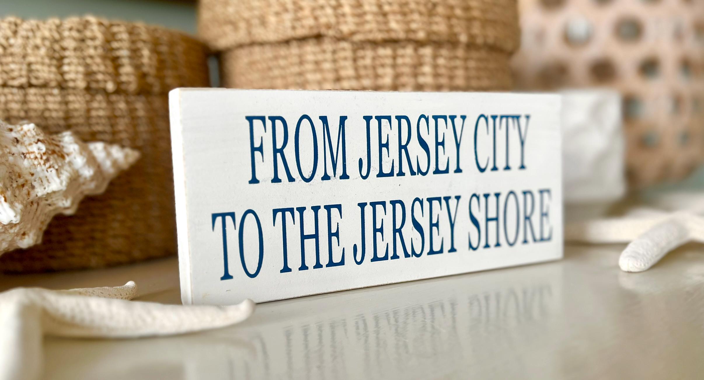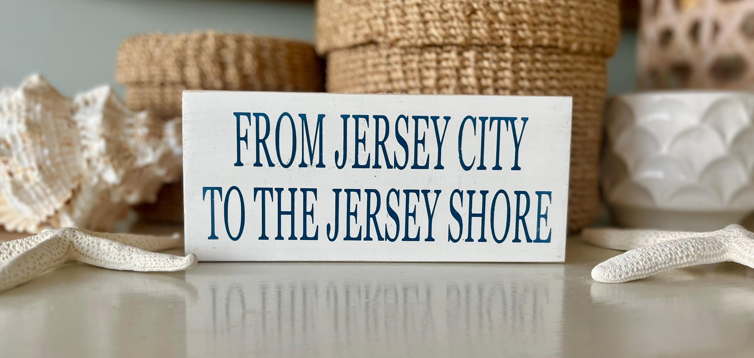 This fun "From Jersey City To The Jersey Shore" wood sign is available in two color options and is ready to ship! These signs measure 8" wide by 3.5" high and have a sawtooth hanger on the back for easy wall hanging or simply prop up on a shelf. Since these are 3/4" thick they make great shelf sitters - they stand easily on their own on any flat surface such as a shelf, ledge, dresser etc. and it's easy to find a nook in your home for these signs.