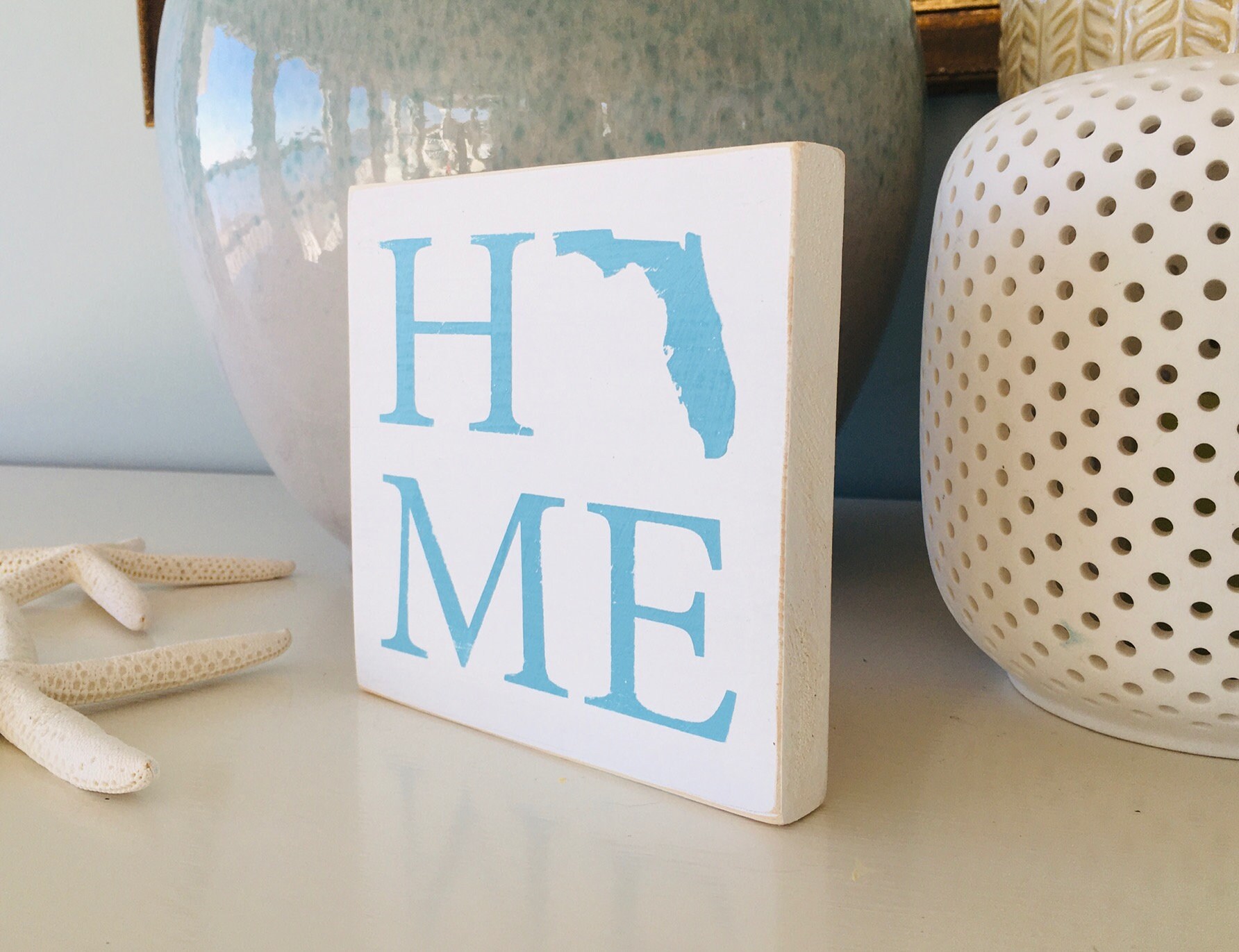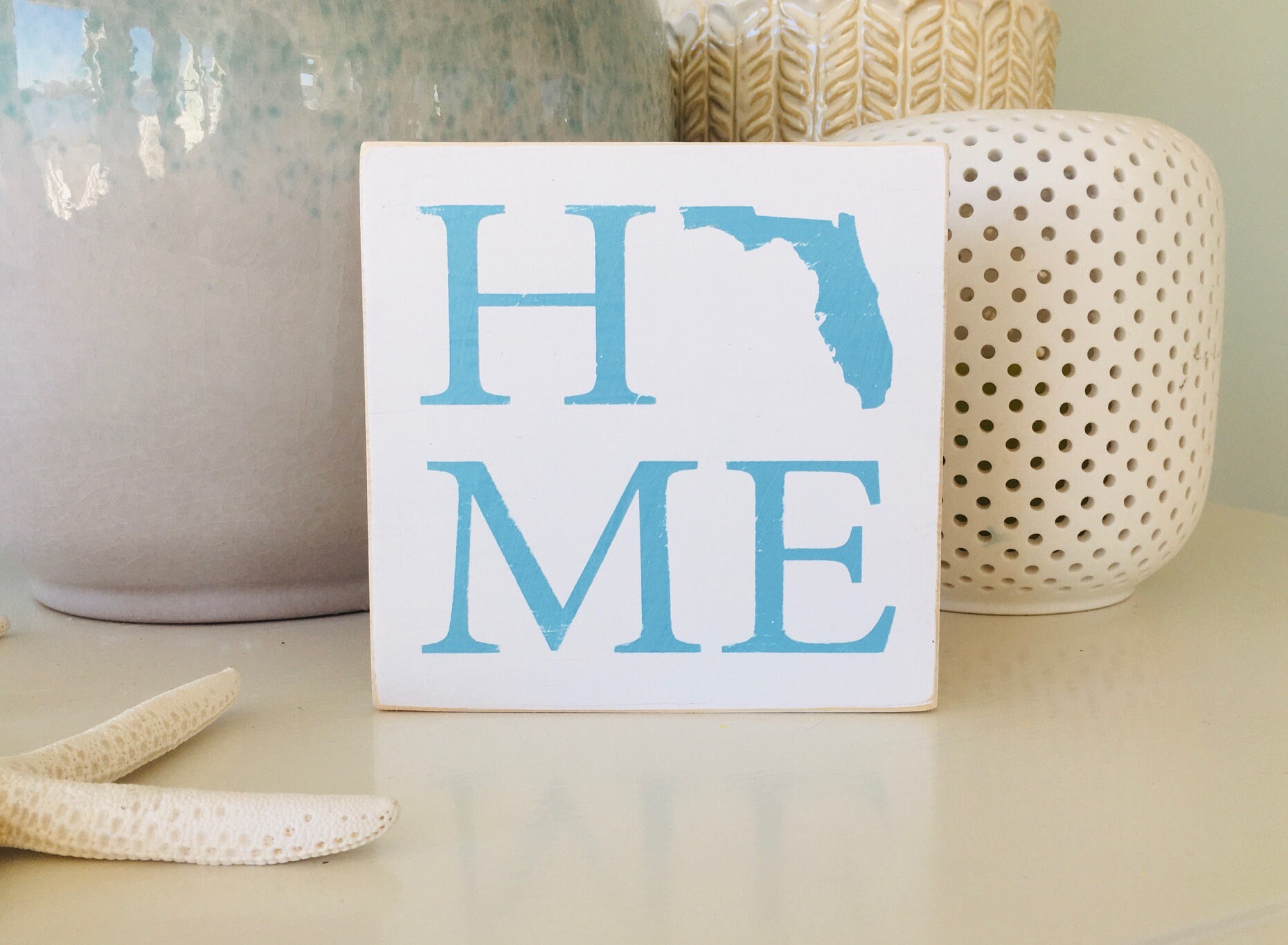 *Florida state HOME beach wood sign - wood beach sign is hand made on a white 5.5" x 5.5" piece of wood with light blue lettering and made to be a shelf sitter meaning it is thick enough to stand on it's own on a shelf, desk, dresser, side table, ledge or any other flat surface but there is also a sawtooth hanger on the back for the option to be hung!